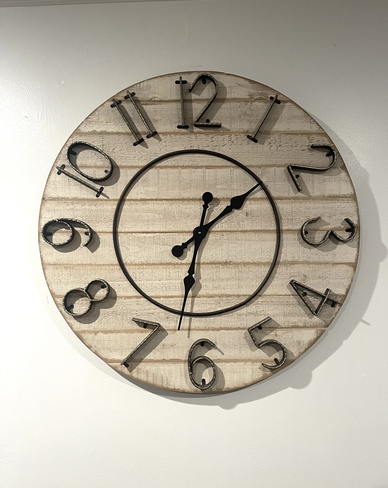 This Farmhouse Distressed Wood Wall Clock has stopped working but it just need clock parts replacement that you can easily buy it online like Amazon or nearest hardware store. Approx. Measurements: Height: 32.5 inch Width: 31.5 inch Pick up: Mission Hills, CA 91345