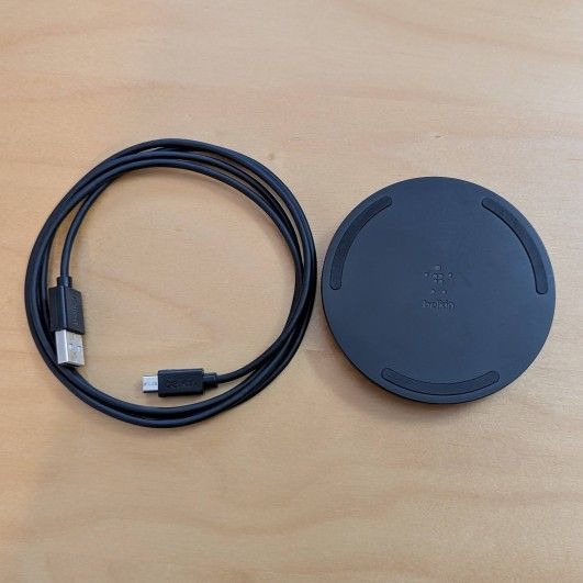 Belkin Qi wireless charging pad (model: WIA001V2) in like new condition. - Compatible with Samsung, Android, Apple iPhone. - Includes micro USB cord.