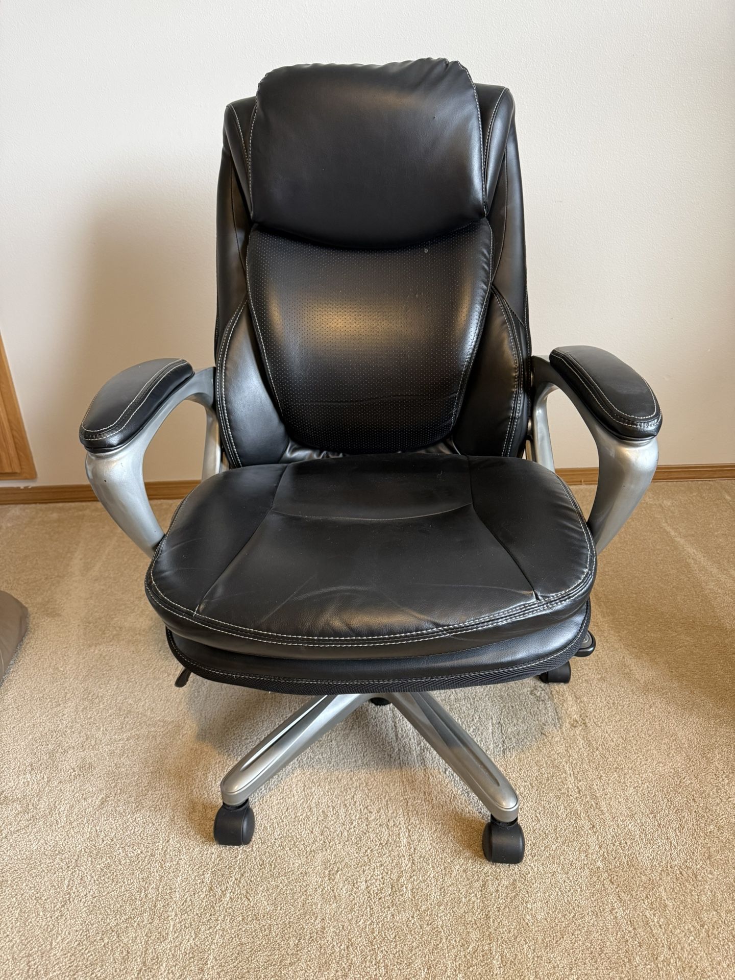 Premium Serta executive chair featuring Smart Layers technology and memory foam for all-day comfort. Originally purchased for $450; excellent support for a home office setup. • Features: Pneumatic height adjustment, tilt-tension, and tilt-lock. Deep layered body pillows and padded armrests. • Condition: Very clean, smoke-free home. No tears or peeling in the leather. • Color: Black with silver accents and contrast stitching. • Price: $100 • Location: Duvall pickup.
