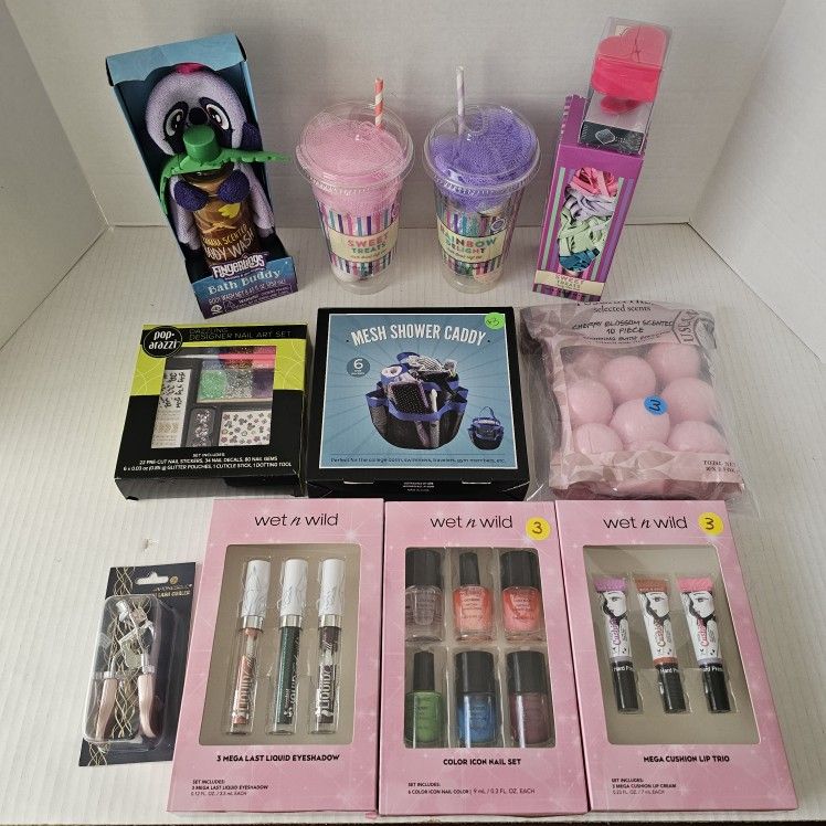 Beauty Sets NEW 😍Includes: (2) Bath Bomb & Luffa Sets, Pop Arazzi Nail Decal Set, Wet N Wild Liquid Eyeshadow, Wet N Wild Nail Polish, Wet N Wind Lip Gloss, Mesh Shower Caddy, Bath Fizzers 7 Count, Fingerlings Bath Buddy, Dashing Nail Polish Holder, Sweet Treats Candy Floss Soap and Mini Lash Curler $3 Each or ALL 12 items for $30 (Retail Value $71+) Pick Up East Boca Raton (Spanish River Just East of 95), Sunrise (Oakland Park & University), Coral Springs