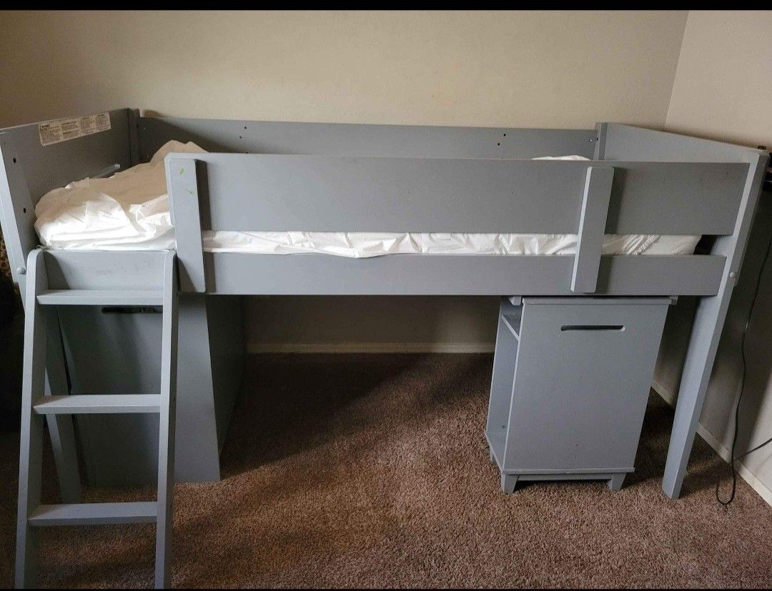Loft bed with built in desk and drawer. You can separate the drawer. Fits a twin mattress (mattress not included). Sold as is. There is normal wear. Pick up only.