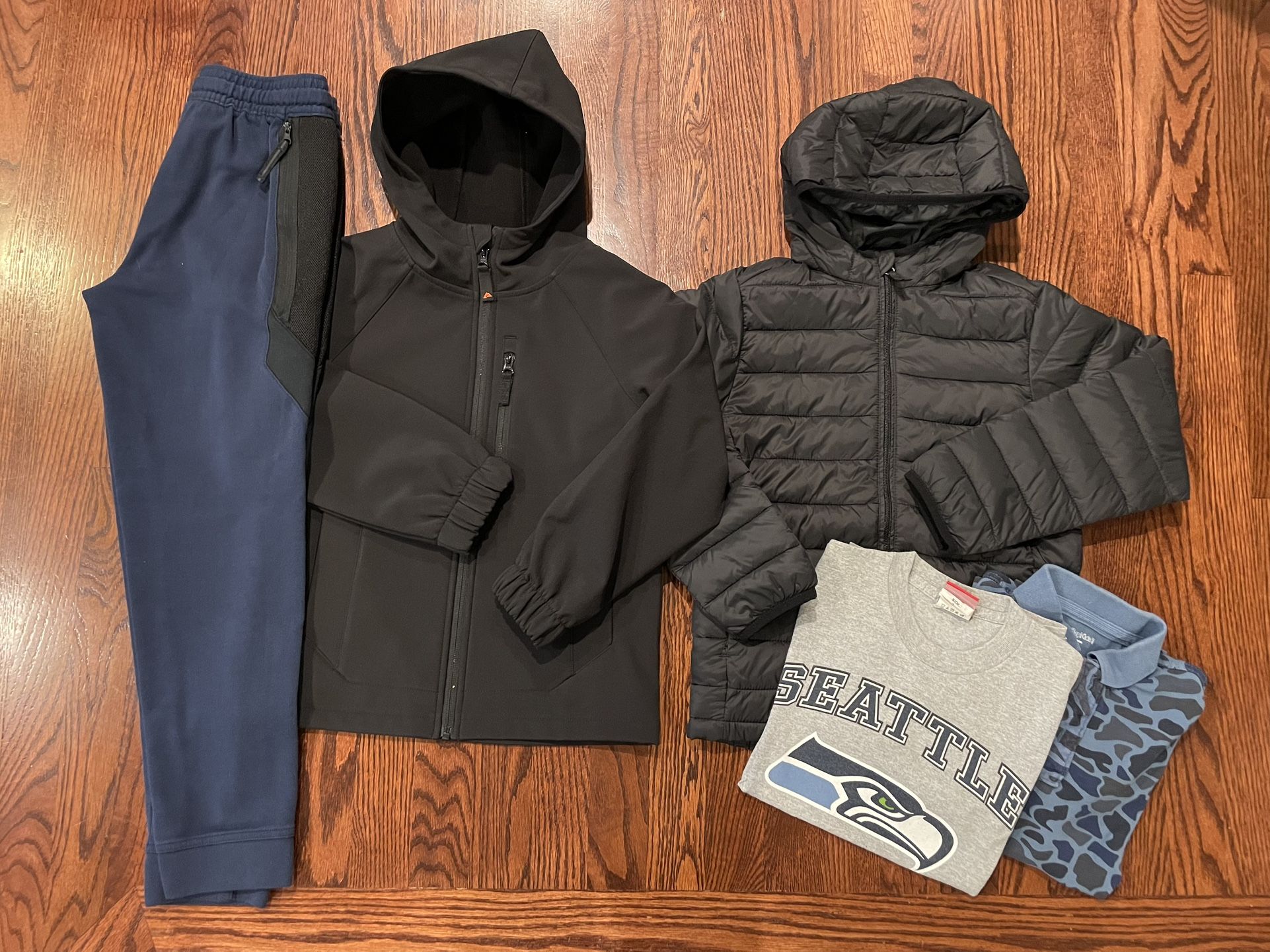 Includes Nike sweat pants, Seattle Seahawks shirt, Ozark Trail waterproof jacket, Amazon Essentials Puffer Jacket and Gap Kids polo. From smoke and pet free home. Pickup in Renton Fairwood area on the Kent boarder.