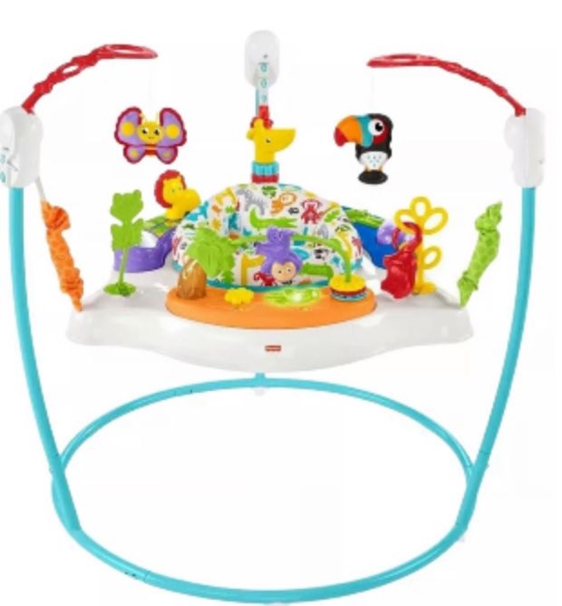 Infant activity jumperoo gym with lights and music. Can be adjusted to three heigh levels . Easy to put together. Disassembled and ready to go.