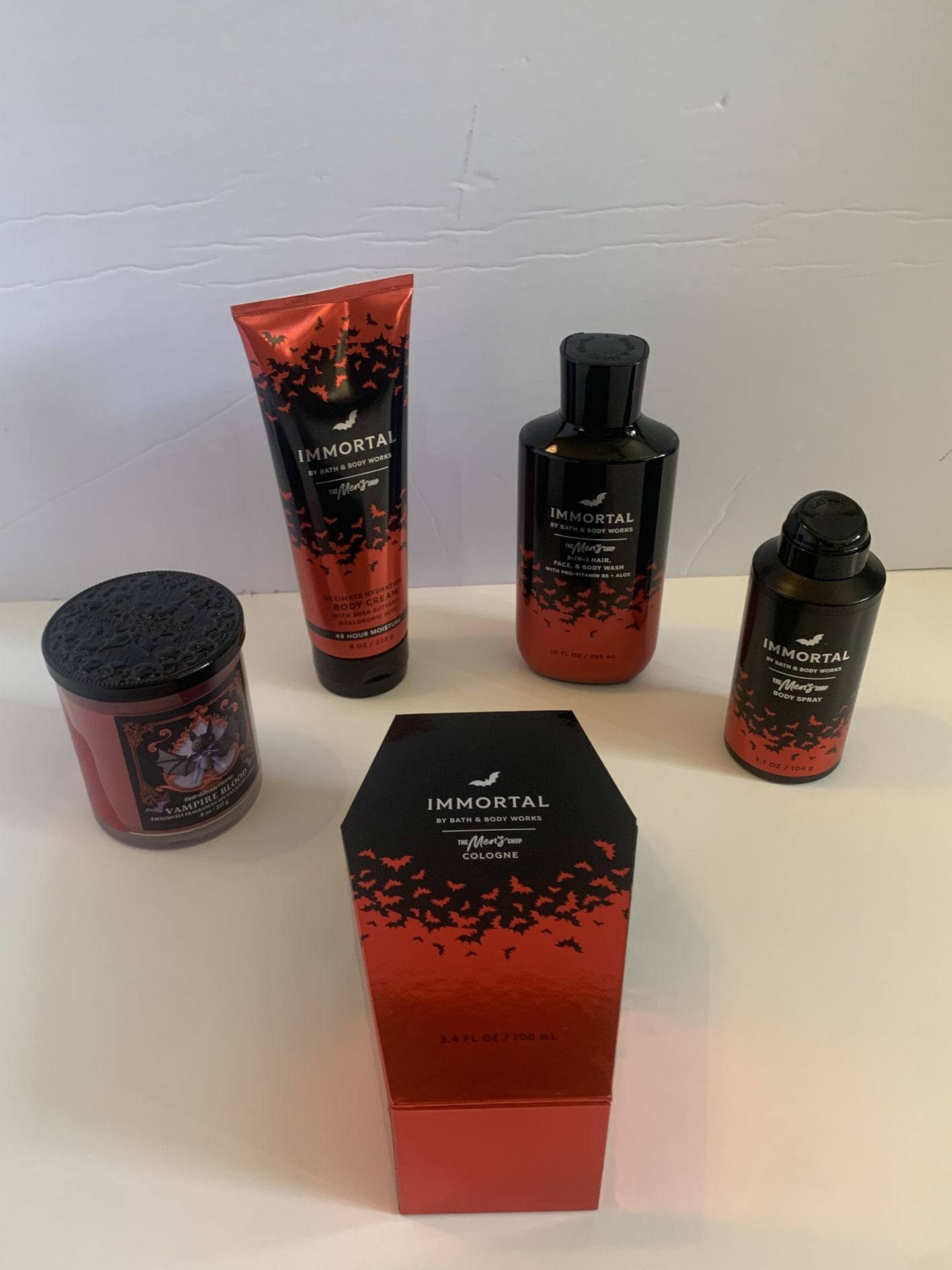Brand new in box. Items retail for $140+ Cash or Zelle preferred Located in the clear lake / Webster area First come first serve More information about the product: Brand new Entire set of the 2025 bath and body works immortal collection.  Includes: Immortal cologne, 3.4 oz Immortal body cream, 8 oz Immortal body spray 3.7 oz Immortal face, and body wash 10 oz Vampire blood candle 8 oz
