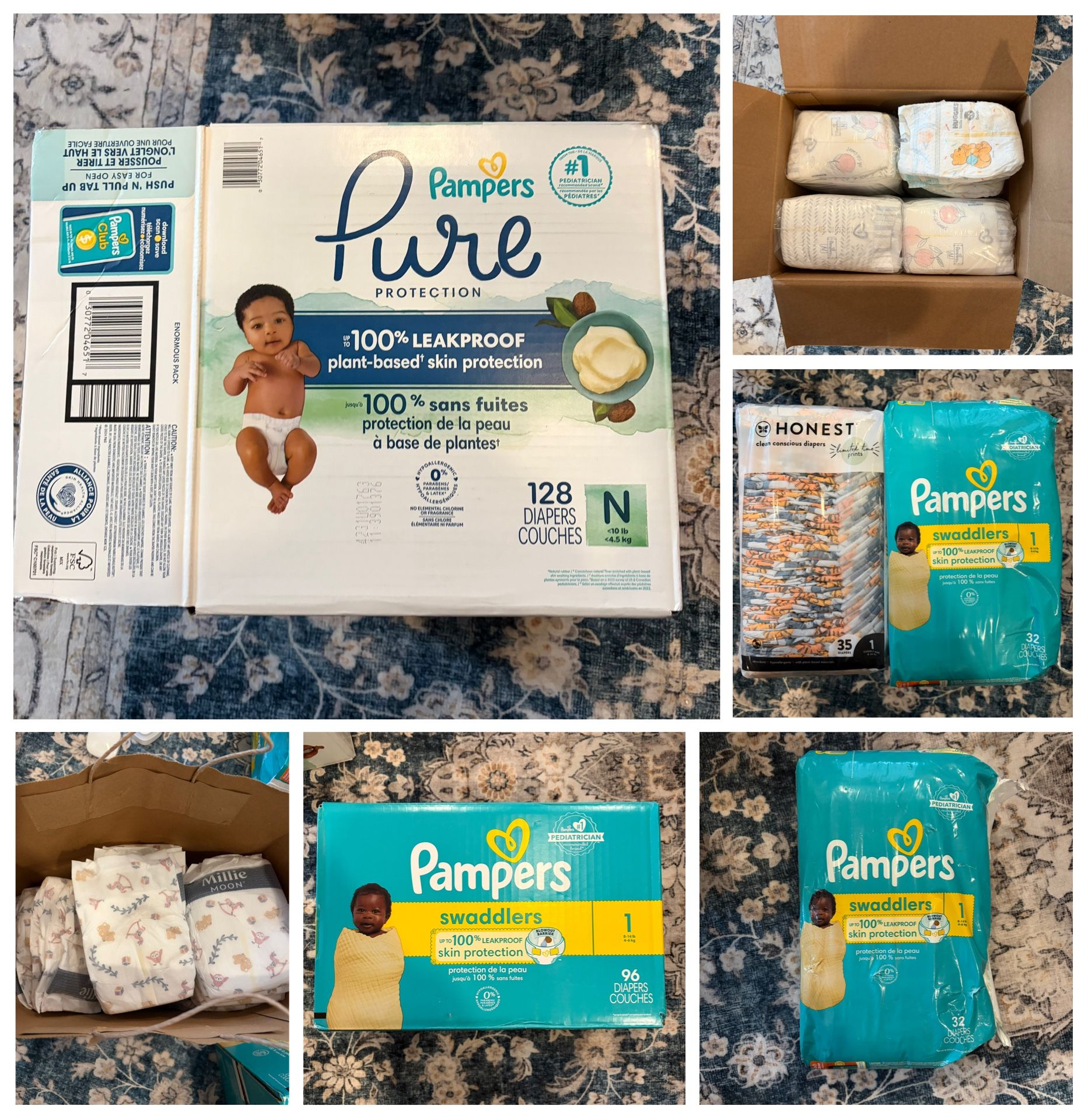 Newborn & size 1 diapers to buy or trade for sizes 3-5. Includes: - Newborn- 1 full sleeve unopened, 1/2 sleeve opened but in packaging of pampers pure. Also includes 1/2 sleeve opened of miscellaneous totaling 100+ diapers filling box of 128 pictured. - Size 1 pampers swaddlers unopened (160 total) - Size 1 honest unopened (35 total) - Size 1 Millie moon opened (50 total) Approximately 350 diapers total. Valued at $130+
