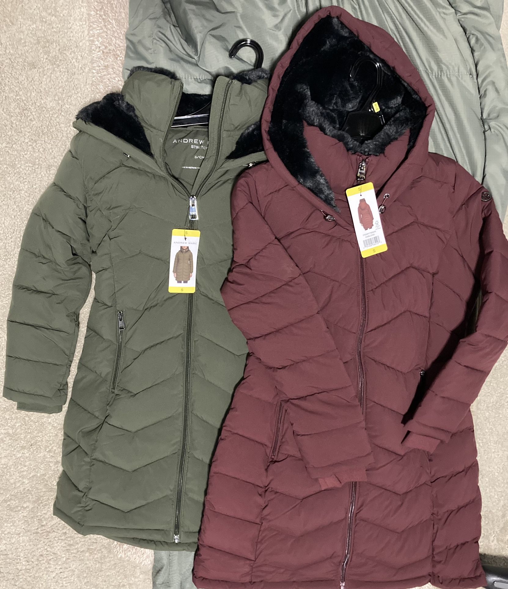 Nwt $35 Each! Fixed bib with zipper closure Stand collar with attached hood Snap front placket Cozy faux fur lined collar and hood 2 front pockets with zippers Adjustable draw cord at hood Description The Andrew Marc Ladies Walker Jacket is here in time for the colder season. This jacket features a fixed bib for warmth with a zip closure, to truly keep all the heat in when out in the cold weather. In addition with a faux fur lined collar and hood, which will help to keep you cosy. Material Composition: Shell: 100% Polyester Lining: 100% Polyester, Faux Fur Inside Hood And Collar: 100% Polyester. Small Size Only!!!