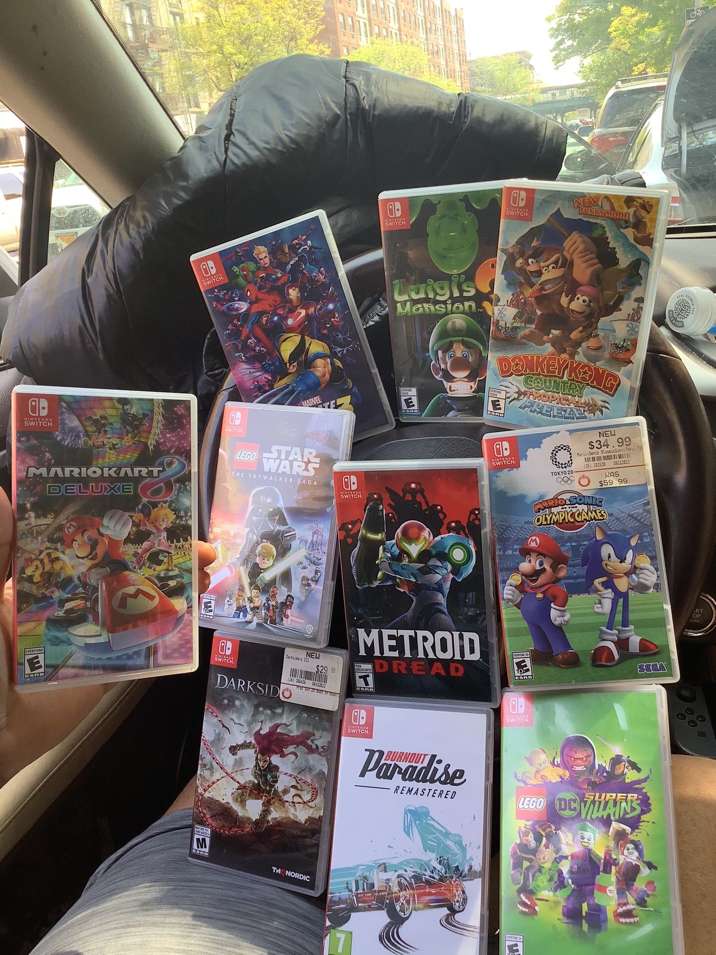 Let me know what games you are interested willing to sell separate Metroid dread - $36 Star Wars the skywalker saga - $20 Mario kart 8 deluxe - $35 Dc super villains - $20 Donkey Kong country tropical freeze - $33 Darksiders 3 - $20 Marvel Ultimate Alliance 3: the black order - $36 Burnout remastered - $20 Luigi mansion 3 - $34 Mario & sonic at the Olympics Tokyo 2020 - $45