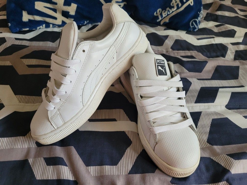 For Sale is a pair of EUC white PUMA BASKET LEATHER shoes in a mens size 8. $30 NO DELIVERY.