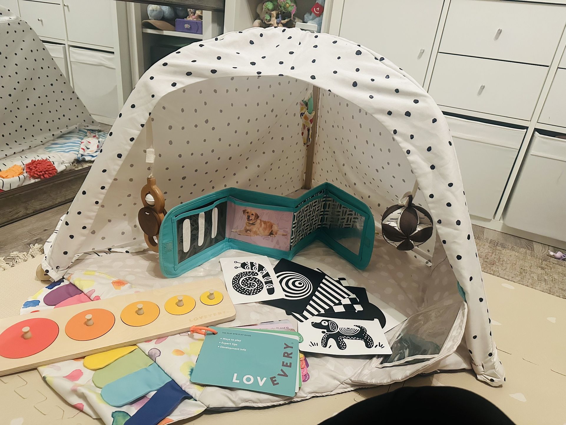 Lovery Play Gym with all accessories and tent. I'm also including a lovery puzzle and the lovery photo book with inserts all in great condition. It comes with the crib color contrast banner this is the only thing that is not lovery.