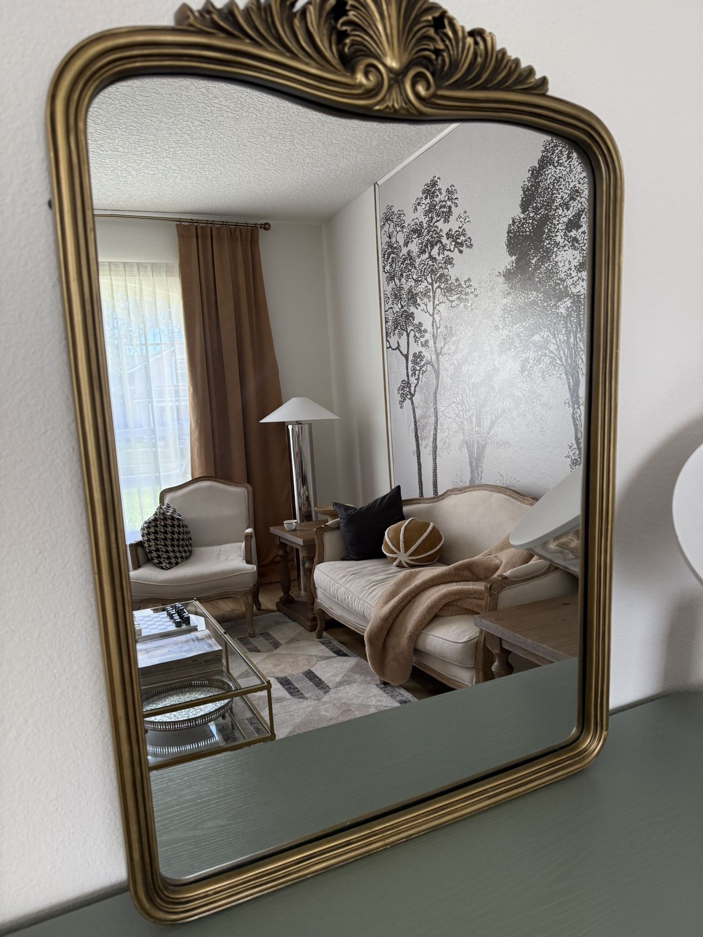 Brass mirror can work as a vanity or fireplace mantle mirror size 36” x25”