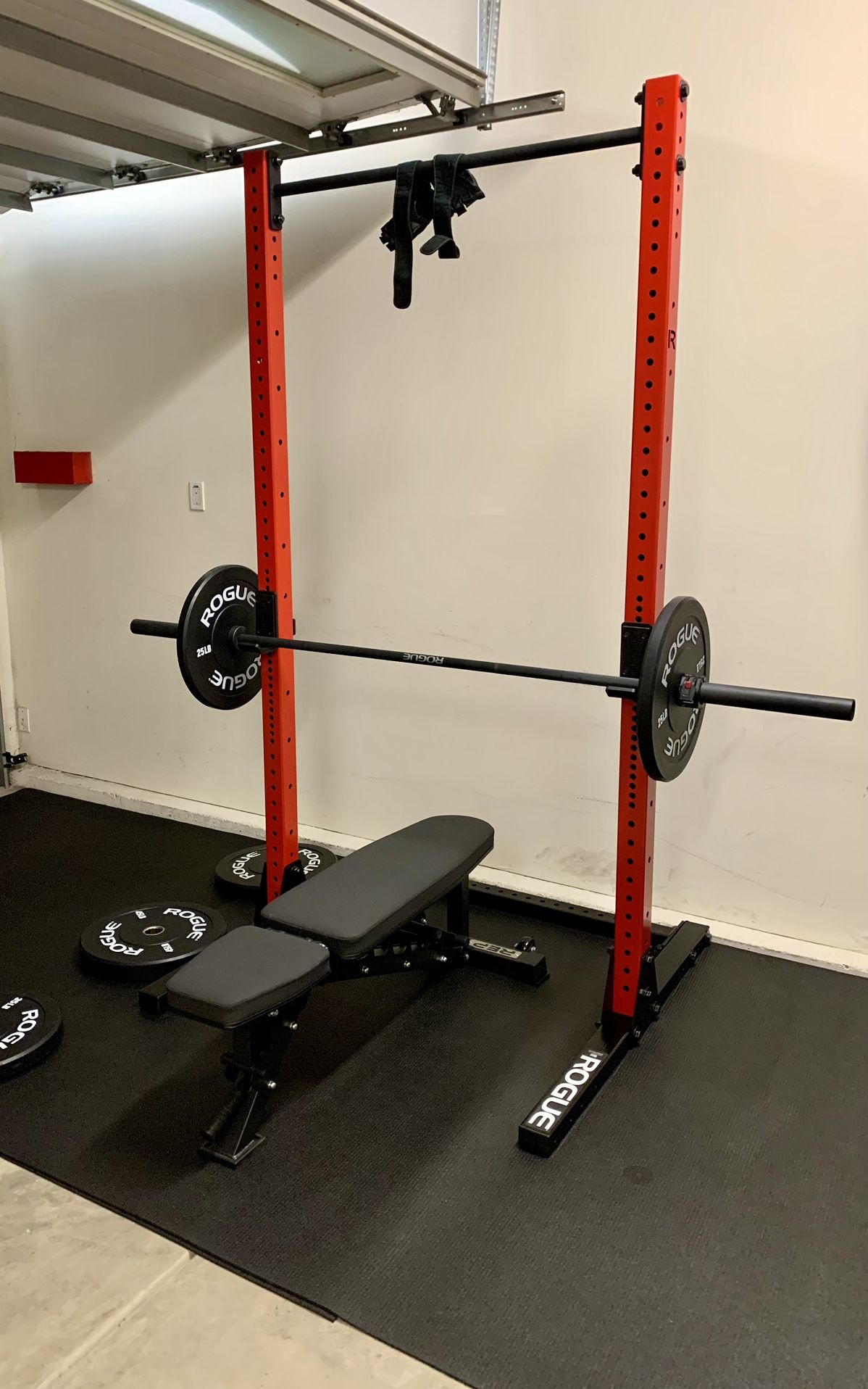 Like-New barely used, always kept indoors (garage): Rogue SML-2 rack with pull-up bar (msrp $515) Rogue Ohio Cerakote black/black bar (msrp $350) 260lb Echo bumper set - 2 of each - 45lb, 35lb, 25lb, 15lb, 10lb. (msrp $583) Rogue collars (msrp $40) Also available (not included in price): REP Fitness Adjustable bench. REP bumper tree.