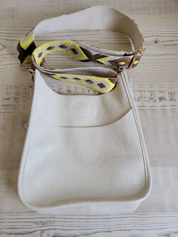 Ahdorned White Vegan Leather Messenger Crossbody Bag With Patterned Straps