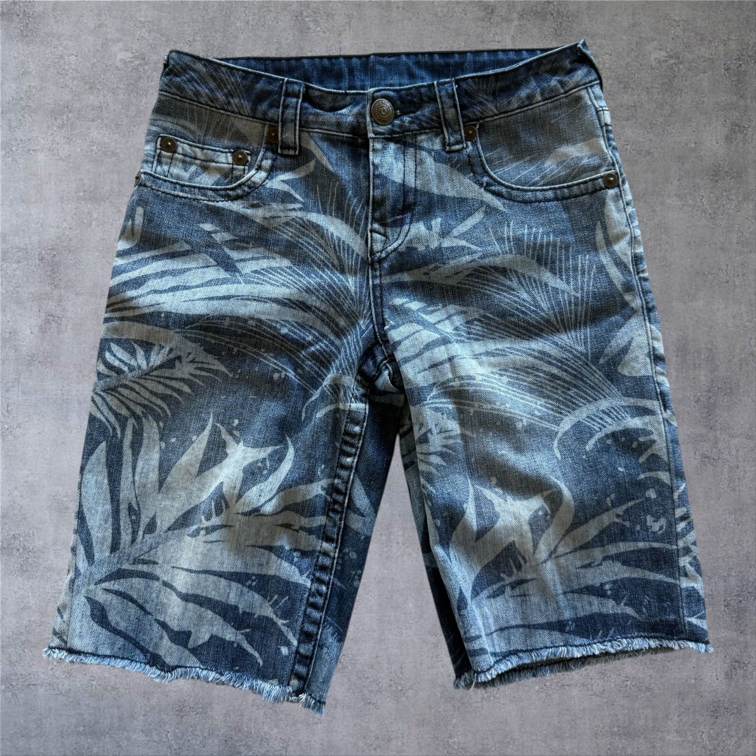 True Religion Boys Palm Tree Denim Shorts Size 12 Blue Tropical Summer Bermuda • Brand: True Religion • Model/Style: Palm Tree Shorts • Size: 12 (Boys) • Material: 100% Cotton (Rigid Denim) • Fabric Wash: Medium/Dark Wash with White Print • Theme: Tropical, Hawaiian, Resort, Streetwear • Country of Origin: China Flat Measurements: Waist: 13.5 in Rise: 7.75 in Inseam: 10 in Total length: 19.5 in Leg Opening: 8.5 in