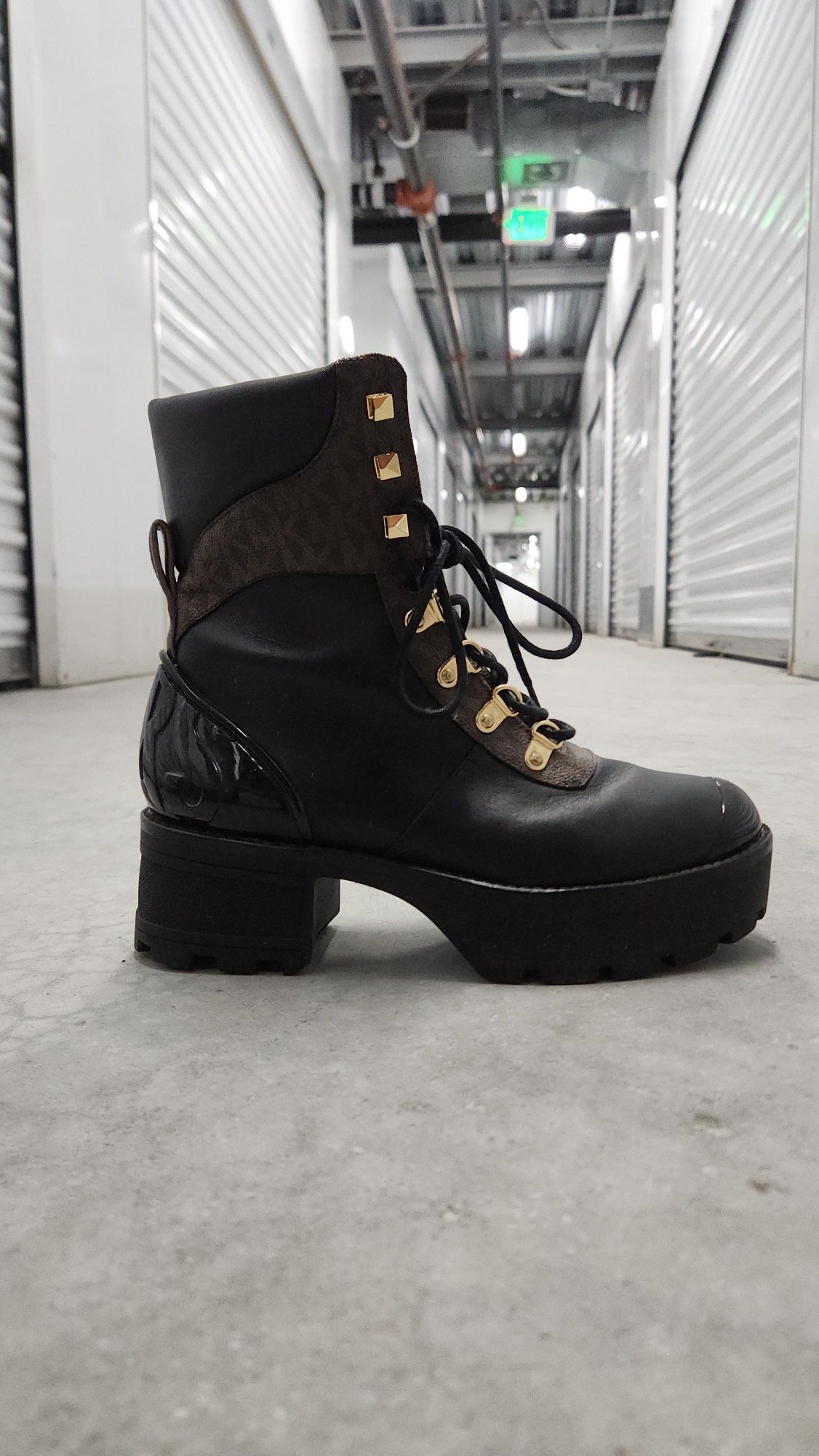 Selling a pair of Michael Kors "Starr" black leather ankle booties in women’s size 7.5. These have great gold hardware details, including studs around the bottom and an MK logo buckle on the side. They are in good condition with some normal light wear on the soles. The leather is still in great shape and the side zippers work perfectly.