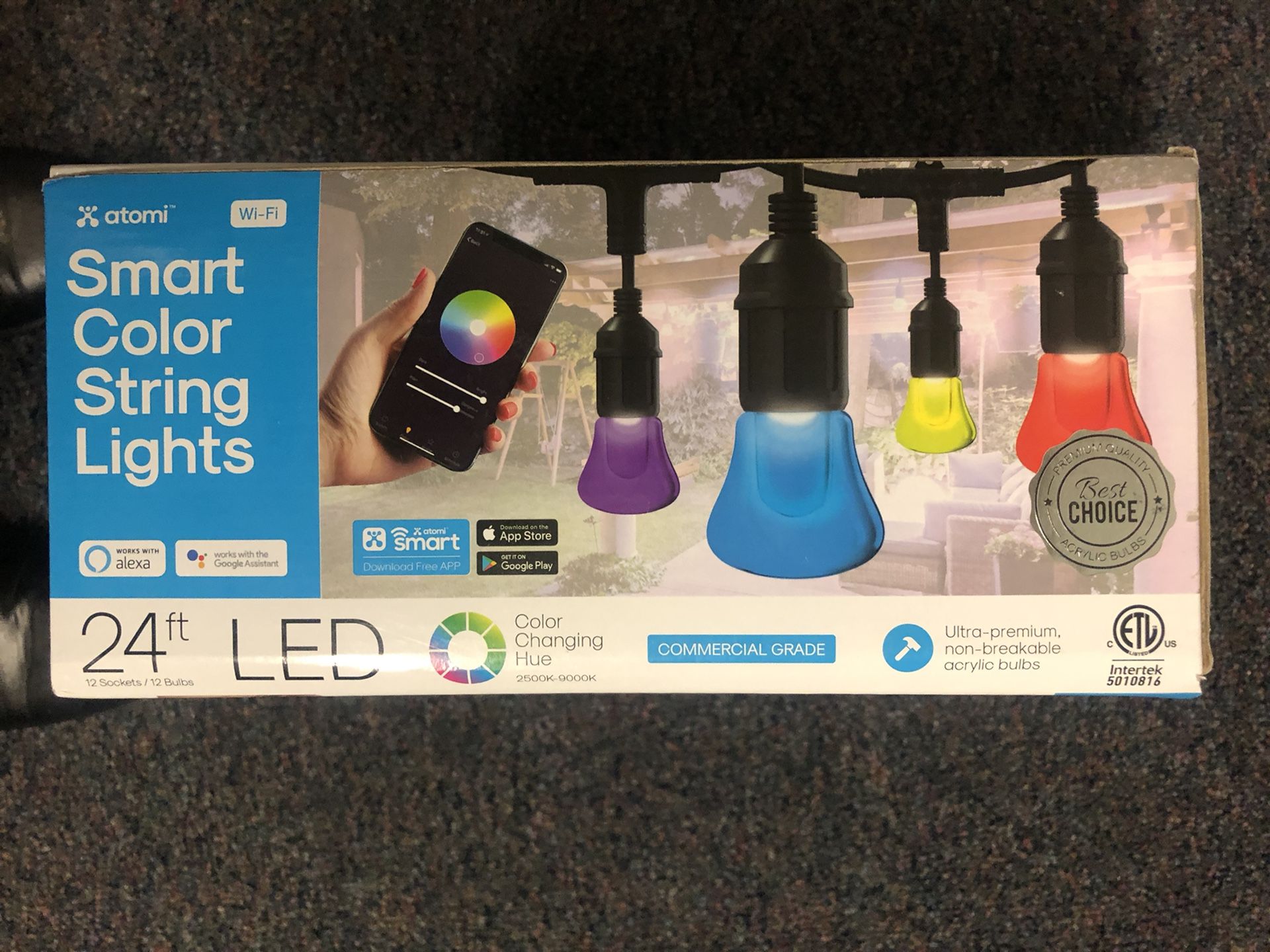 Brand New In Box Never Opened. Sell for $80 on Amazon Asking $25 atomi smart Outdoor LED String Lights Smart WiFi Controlled from Anywhere, Color Changing and White 24 FT - 12 RGB Acrylic Bulbs, Waterproof & Unbreakable Solid Acrylic, Alexa, Google, iOS, Android