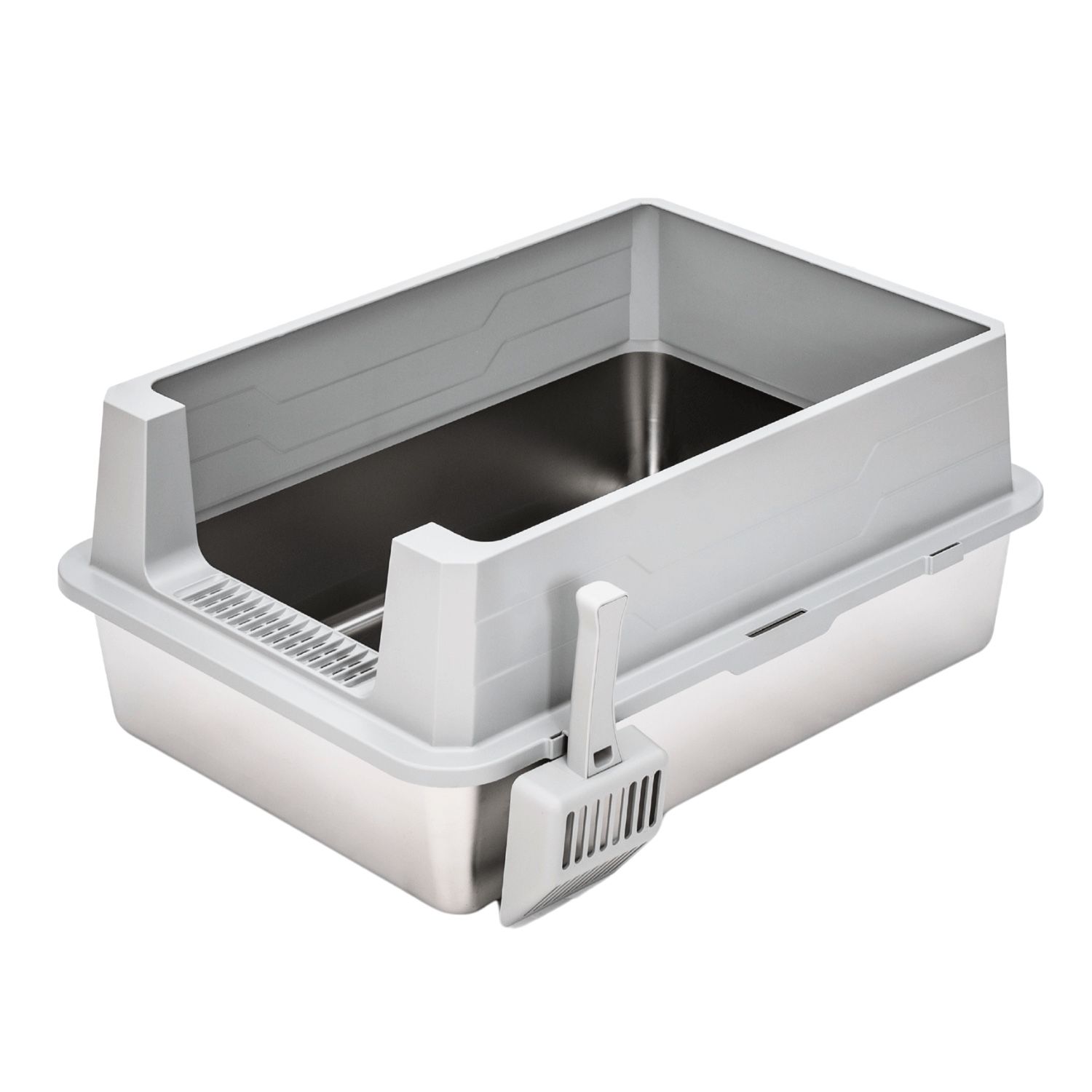 Designed to comfortably fit Maine Coons and other large breeds. Perfect for cats over 25 lbs and multi-cats. It resists scratches, odors, and wear, lasting far longer than plastic alternatives. Non-stick surface prevents litter buildup and residue, making daily cleaning effortless. High walls and overlapping edges effectively prevent litter scatter and urine leakage. Built-in hollow platform helps catch litter from cat’s paws, efficiently reducing tracking. Open-front entry offers easy access for all cats. In-The-Package Stainless steel base x 1 Enclosure x 1 Scoop x 1 Anti-slip stickers x 4