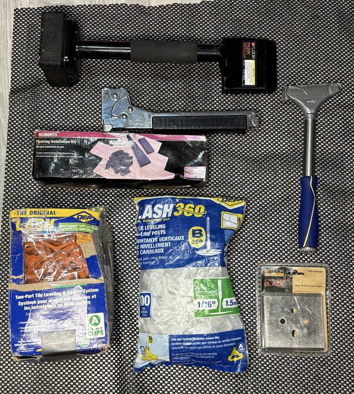 Mixed Hand Tools for Flooring Installation Brand New Supplies aswell for Installing Tile & More. Great Little Setup to help you with any Flooring Job 👌🏻 Tools Features: • Finch & McLay Knee Kicker Wall to Wall Carpet Installer, Model #2692 • HT50 Professional Hammer Tacker • QEP 4 in. Floor and Wall Razor Scraper with Handle and Stainless Steel Blade Supplies Features: • QEP LASH 360 1/16 in. Tile Leveling In-line Stems (100-Pack) • QEP LASH360 Yellow Polymer 1.5 in Tile Leveling System Round Caps (300-Pack) • ROBERTS Laminate and Wood Flooring Installation Kit • 4" Replacement Blade for 48" Heavy Duty Scraper Finch and McLay #60506