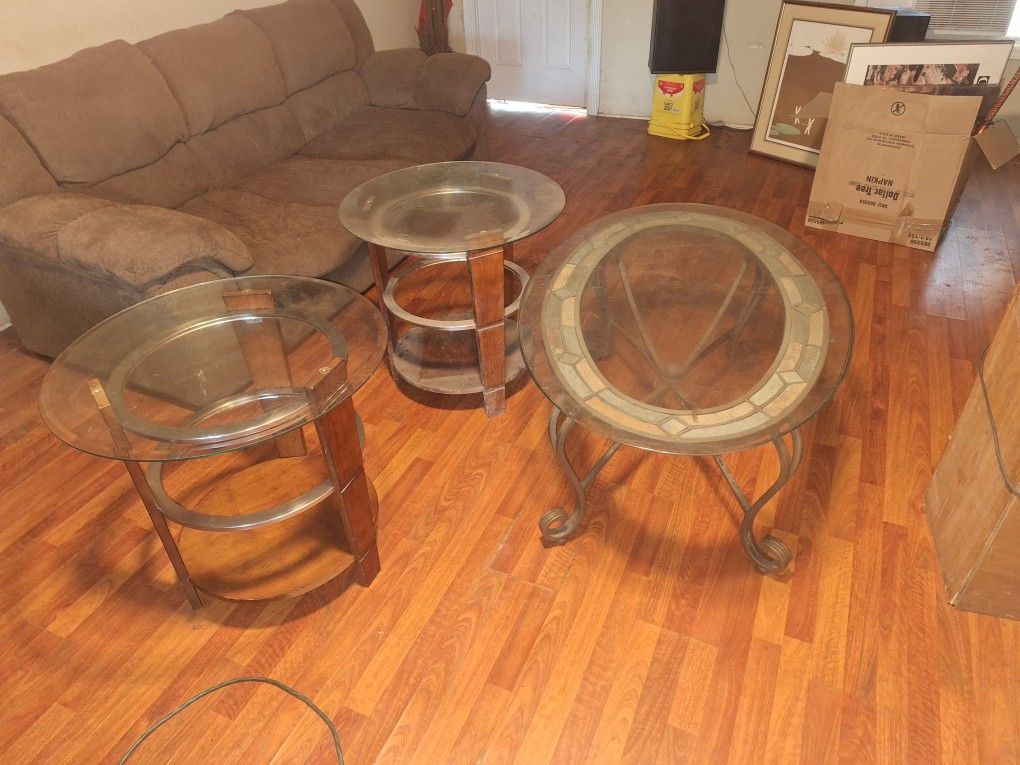 Nice oval coffee table with wrought Iron base and two end tables with wooden bases and round glass tops all in Very good condition. East orlando area, make reasonable offer. Have other misc items also.