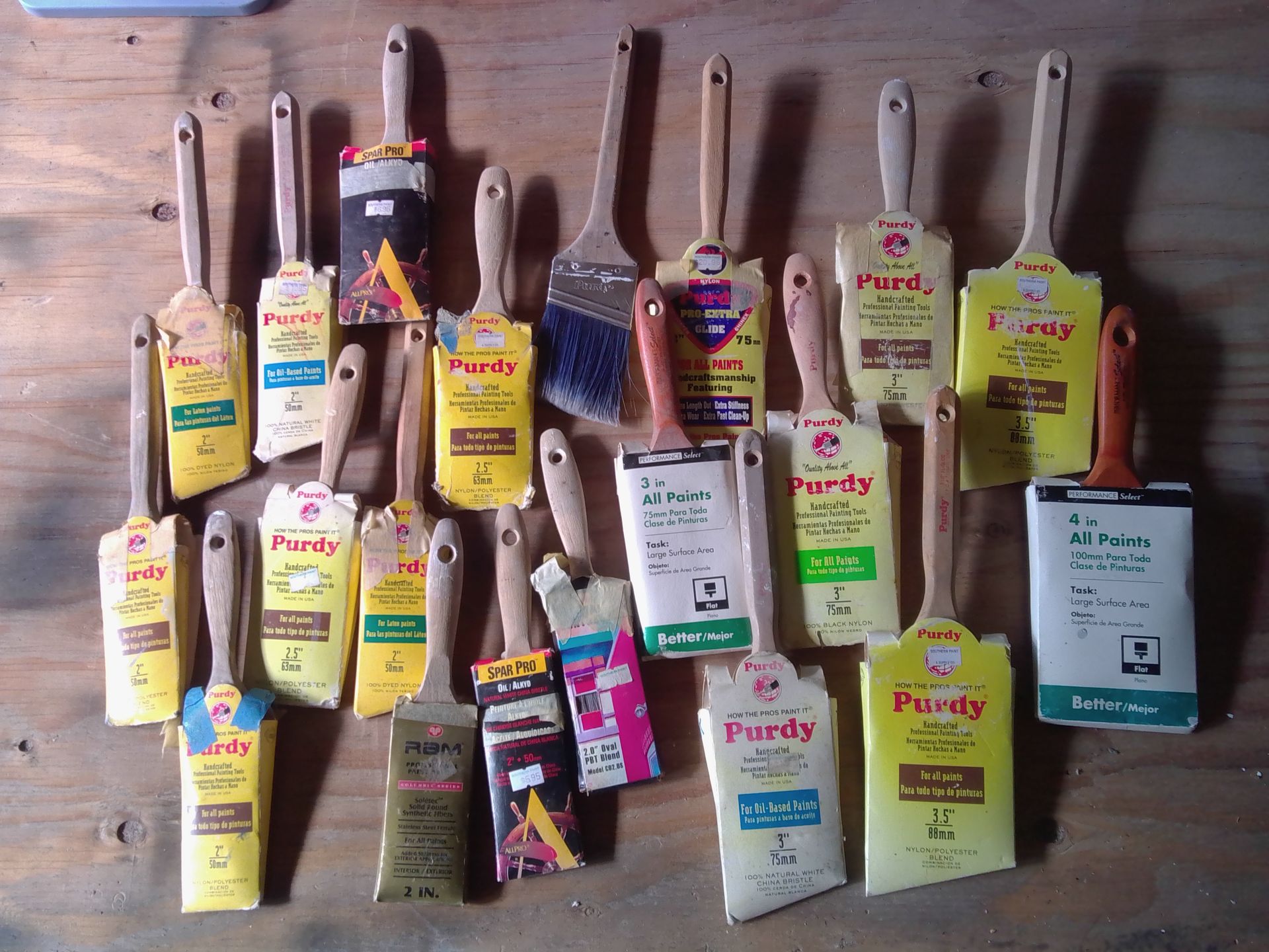 21 total paint brushes, 15 Purdy brand. All are experienced condition, clean, soft, straight 1- 4" 2- 3 1/2" 5 - 3" 5 - 2 1/2" 8 - 2"