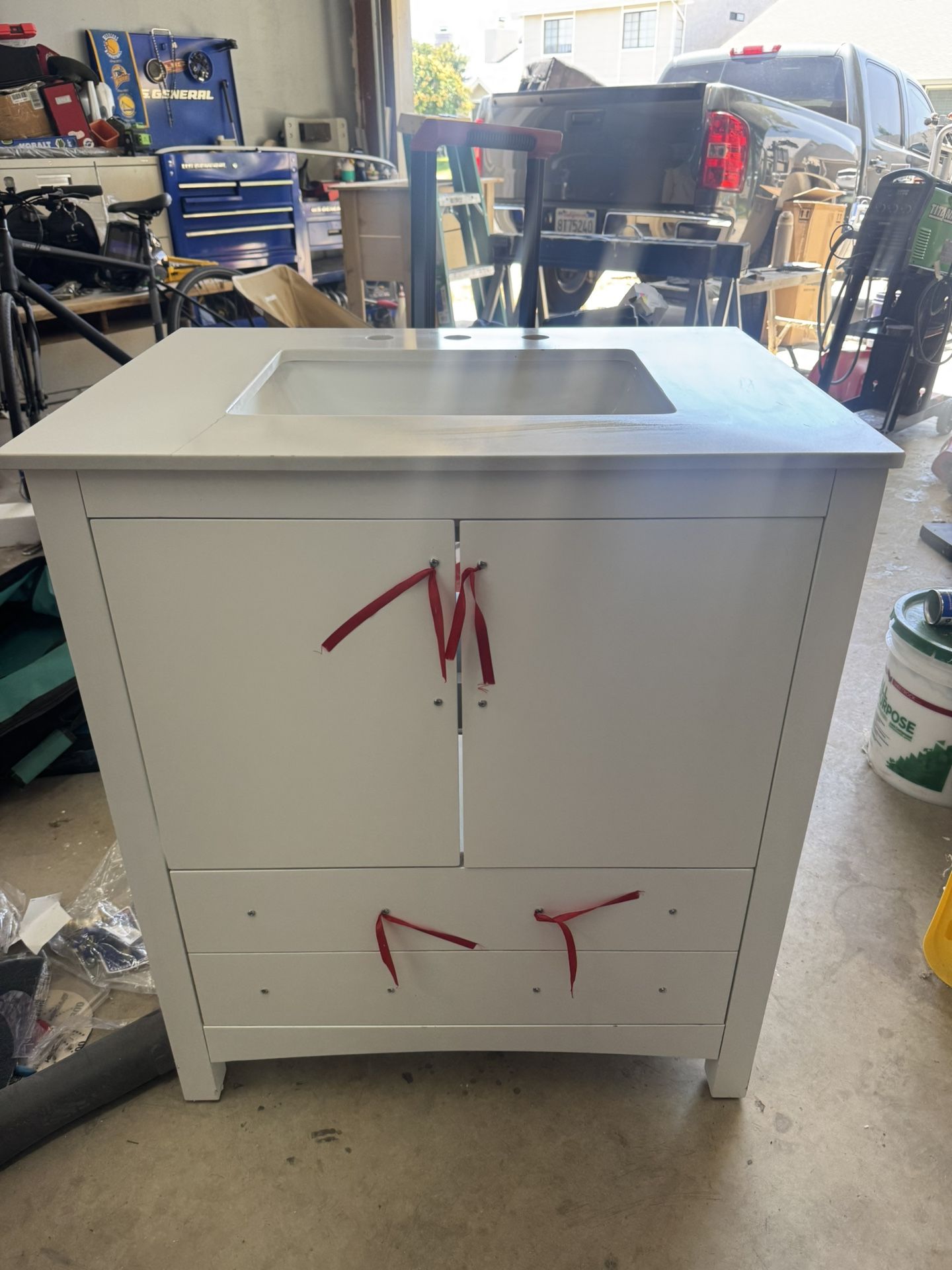 30x22 bathroom vanity. Never installed it so it’s dusty from sitting. Has crack on top but not in the actual bowl. Paint could probably be cleaned up. Pickup in Turlock. 50 Cabinets kitchen tools furniture.