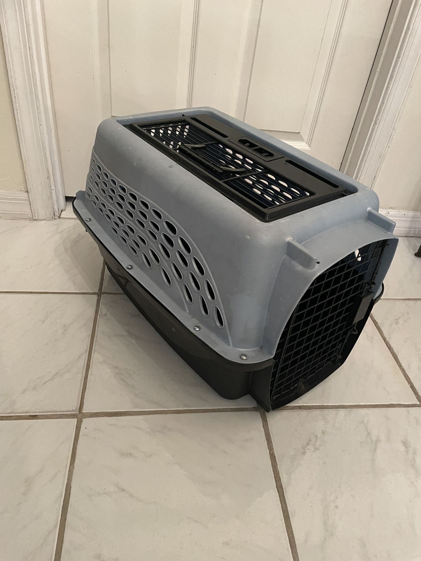 Nice quality small dog or cat carrier 15 inches tall. Blue and black. Opens from the front and top.