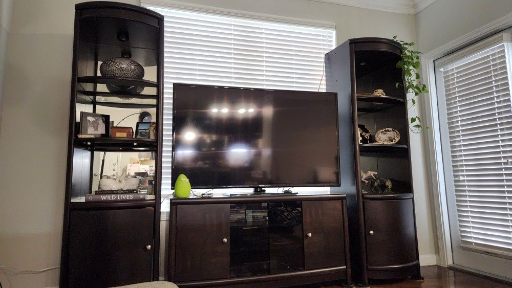 Sturdy, heavy wood entertainment Center. Has mirrored backing on the glass shelves, lots of cabinet space, and perfect for a large tv. Free tv included if you'd like, tv has a line through screen. Didn't bother us too much.