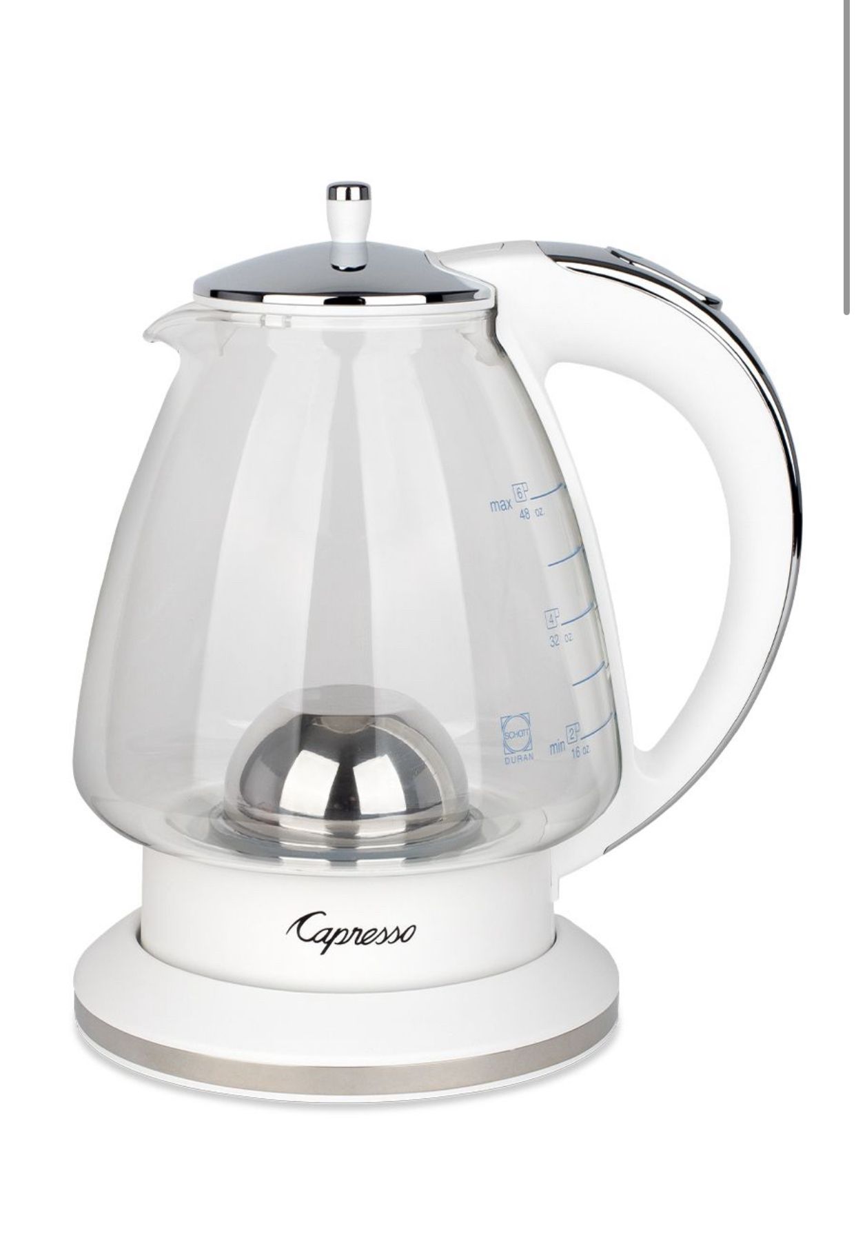 Capresso electric kettle The iconic Capresso H2O Glass water kettle is constructed of German-made Schott® heat resistant glass and has ounce and cup markings for easy filling. A gleaming stainless steel dome covers the highly efficient concealed heating element which boils water fast, quietly and safe…then shuts off automatically. In addition to heating water for tea, the H2O Glass is handy for brewing French press coffee or heating water for cooking such as preparing yeast, instant soups, and couscous. New open box