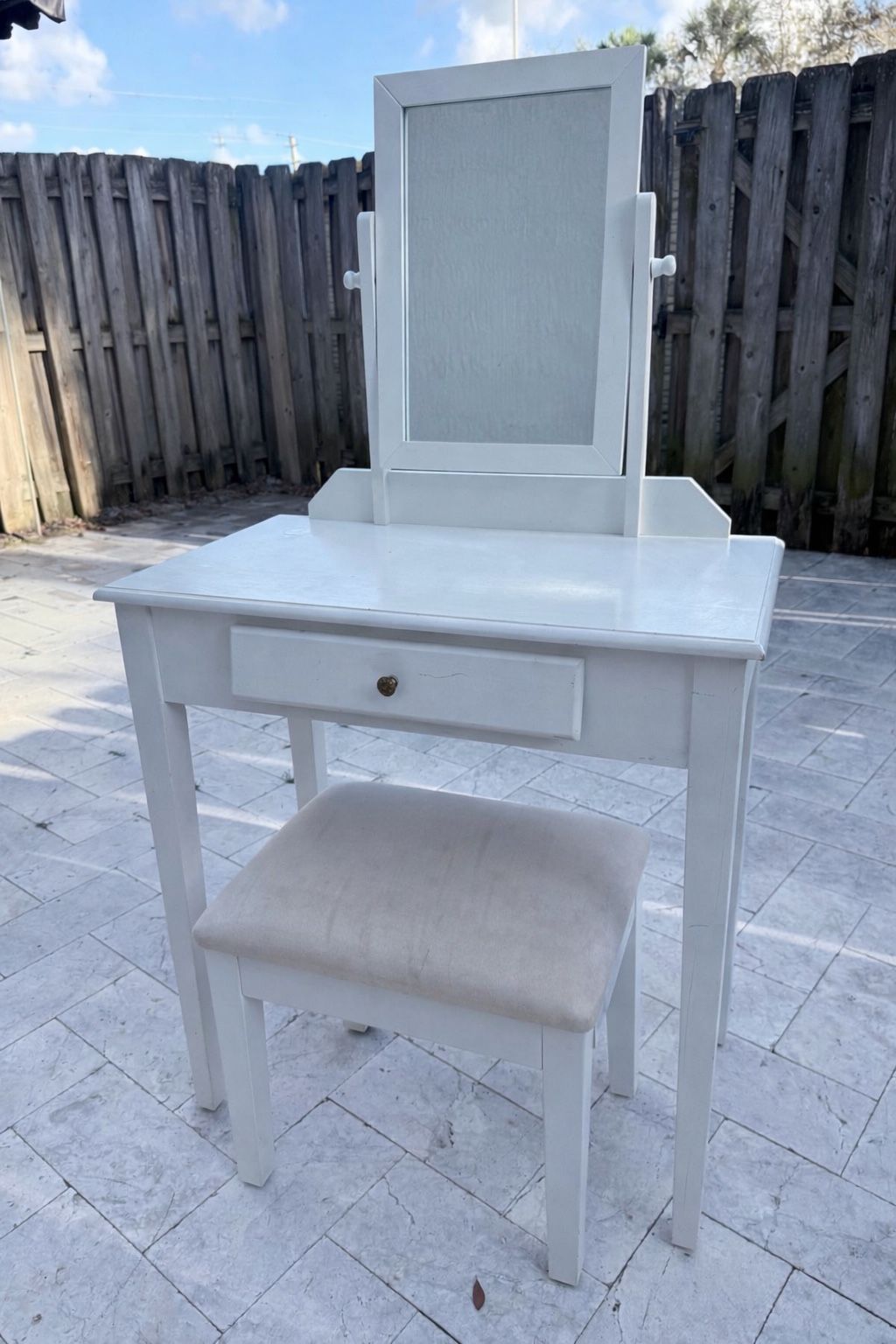 Used Girls white Vanity desk with swivel mirror 28 long by 16 deep. Needs a Little paint but in good condition. Comes with ottomam