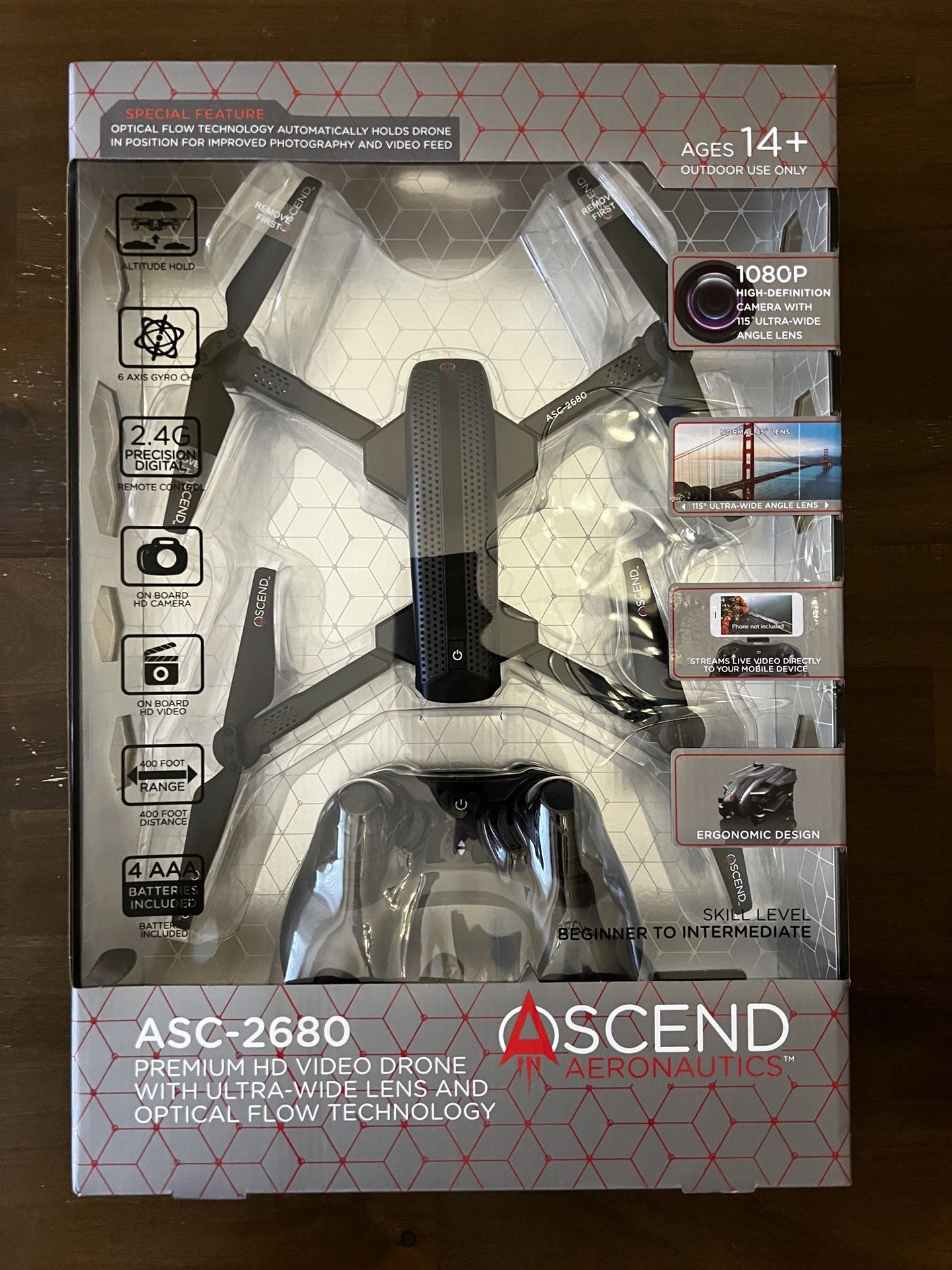 Brand new. Unopened box. Retail price of $102.99. Ultra-wide-angle Camera Lens 1080P HD Camera Streams Directly to your Mobile Phone Flight Training Mode and Range Warning for Beginner Pilots Push Button Auto-start, Hover, and Auto-land Technology Recommended Age: 14+ Years The new Ascend Aeronautics ASC-2680 Premium HD Video Drone is designed for the beginner and advanced pilots in mind, with a 115 degree ultra-wide-angle 1080P camera lens to capture life’s adventures in high-resolution. The ASC-2680 is easy to learn how to fly with our New Flight Training Mode, Range Warning Feature, and Bright Flashing LED Lights, so you can easily locate your drone. The ASC-2680 also includes the latest technology including a six axis gyro + altitude sensors for incredibly stable flight. Includes: (1) Drone (1) 2.4G Wireless Remote (1) USB Charge Cord (1) Rechargeable Lithium Battery in Drone (4) AAA Batteries for Remote Dimensions & Weight: 13.39" W x 14.17" L x 2.56" H; Weight: .3 lb. Ascend Aeronautics ASC-2680 Premium HD Video Drone with Ultra-Wide Camera Lens