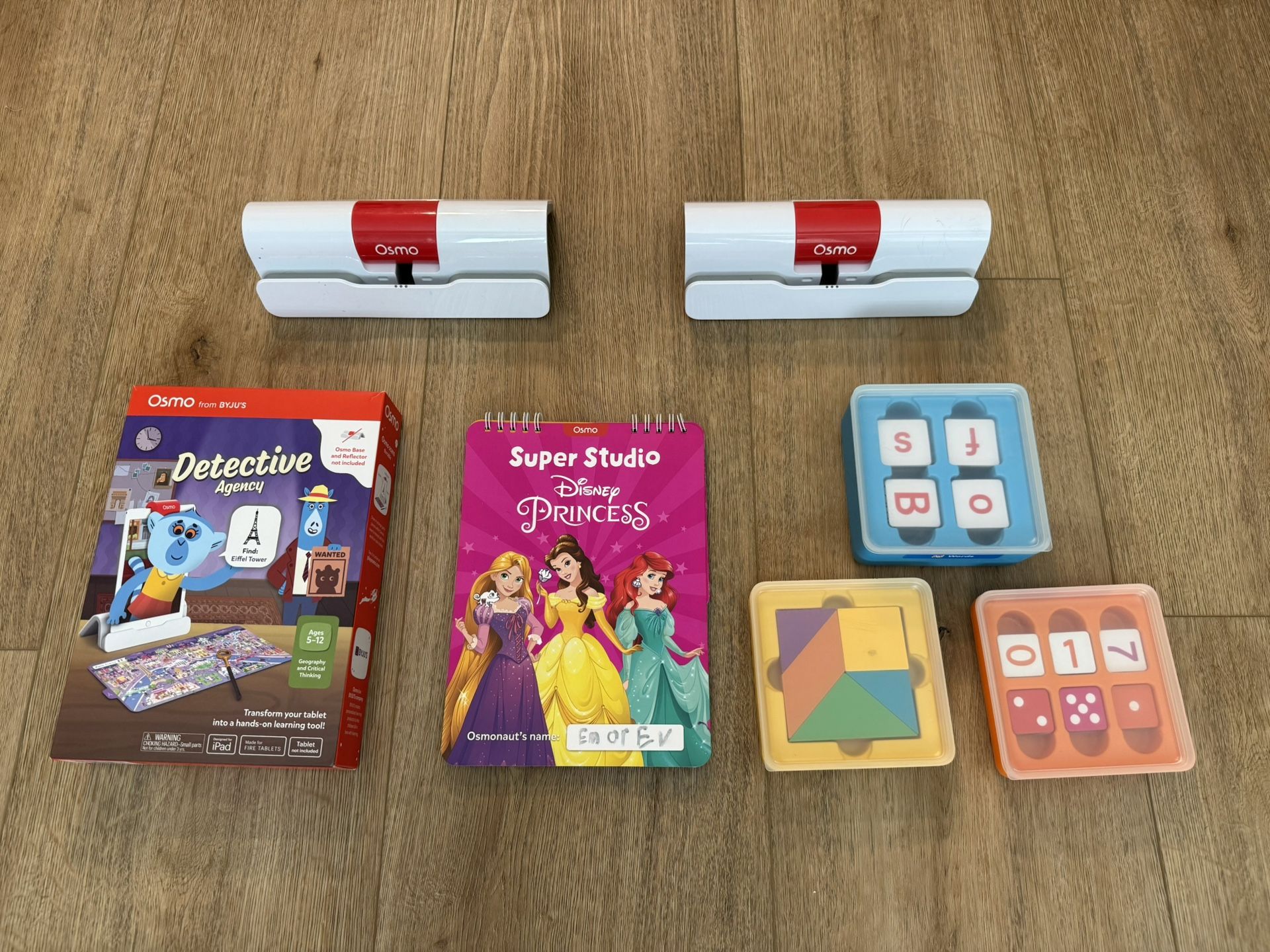 Osmo Genius Starter Kit, Super Studio Disney Princess drawing kit, and Detective Agency game. Comes with 2 iPad bases, Princess drawing booklet (and wipe away rags and wet erase markers), detective agency game, and tangram / number / word tiles. Everything works great, my kids just don’t play with them anymore!