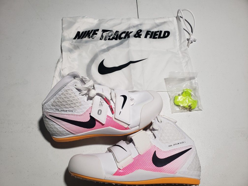 The Nike Zoom Javelin Elite 3 Track Spike in White and Hyper Pink is a men's athletic shoe designed for track and field activities. Featuring a lace-up and strap closure with spikes on the sole for enhanced traction, this mid-top sneaker offers a standard shoe width in a UK size 9 and US size 10, 9.5 or 9. The shoe belongs to the Nike Zoom Javelin collection, known for its colorful and sporty design, making it suitable for activewear during the summer, fall, and spring seasons. Comes with spikes, carry bag and tool