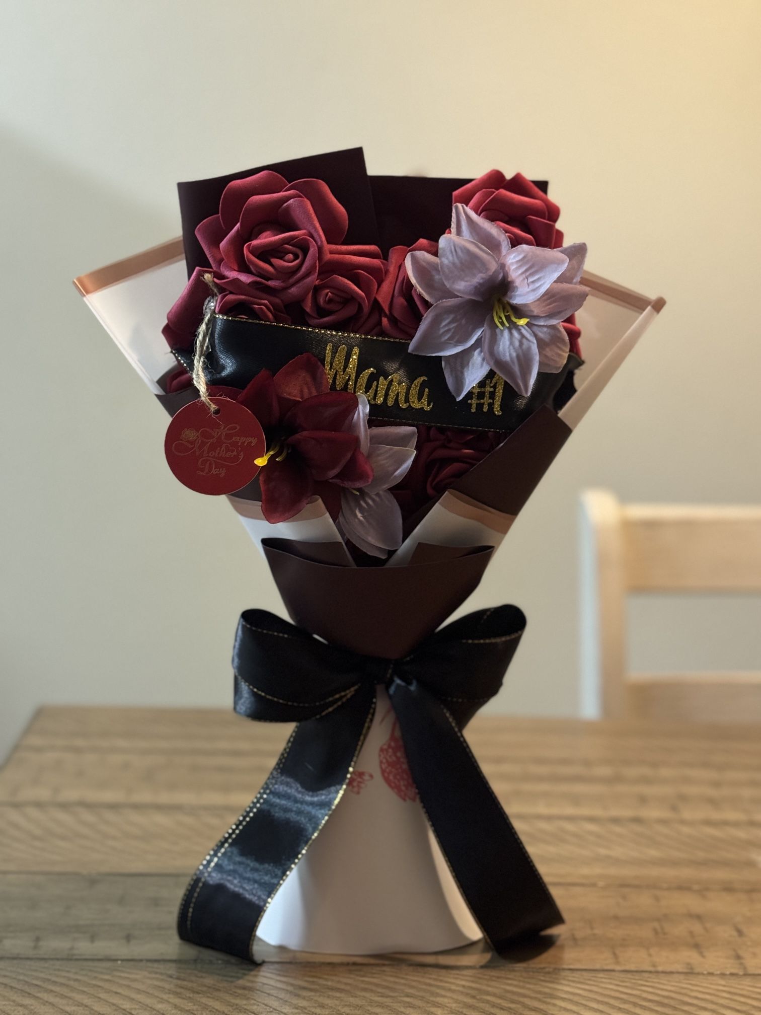Title : Foam rose bouquet Description: • made out of FOAM roses • stands up on its on • can customize what it says • complimentary side gift