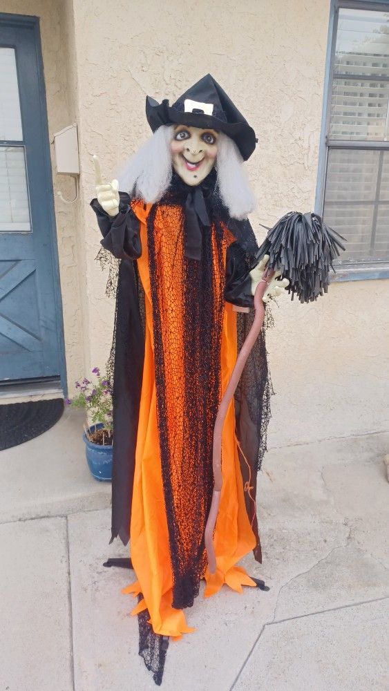 5.5 foot witch decoration. Battery operated and lights up Fully working and with all parts Can either be attached on a stand with metal poles, or hang from anywhere by a black rope on her hat.