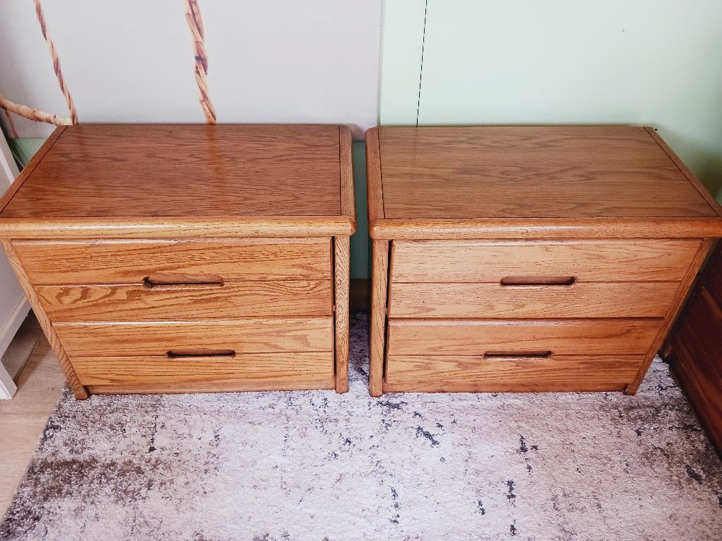 Available, a set of matching nightstands for $400. Dimensions, 28 width, 16 depth, 22 height. Two drawers each, dovetail drawers, on metal tracking. In great condition. I also have a matching dresser for $600. Cash, zelle, paypal. Thank you.