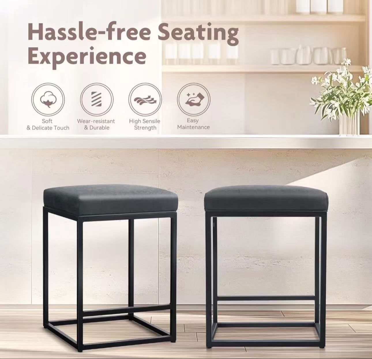 Sturdy Metal Frame and Easy Assembly: The thickness of the metal frame is 3cm, which is durable and not prone to cracking. The Non-slip foot mats can prevent scratches on the floor. It is easy to assemble with just a few screws. In just 5 minutes, you can get a modern barstool for kitchen island Thickened Seat Cushion: The counter height bar stools padded with 3.54" high density sponge foam have strong resilience to bounce back to relieve your muscle tension from stiff chairs, and you don't need to worry about seat cushion deformation after sitting for a long time Product Dimension: Size of whole bar stool: 24"H x 14.76"L x 17.51"W, seat cushion width: 18.89", seat cushion length: 15.74", seat cushion thickness: 3.54", weight capacity: 350lbs. ALPHA HOME counter stools have larger sitting area, the durable steel frame and thicker cushion for your comfy leisure night Waterproof and Stain Resistant: The seat cushion of kitchen stools is made of PU leather, and the inside is a thickened sponge. Stains do not penetrate the sponge, but only stay on the surface, which makes bar owners and house wives free from trouble customers and kids leaving stain while they're enjoying the food and drink