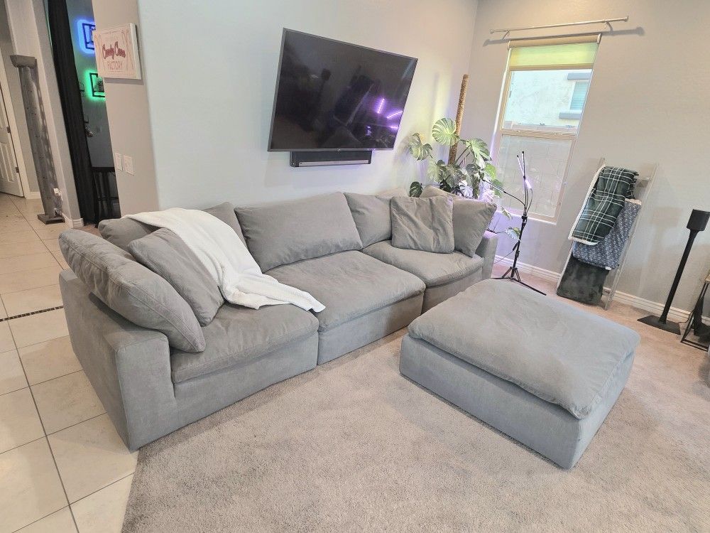 Selling our CloudForm Cloud Couch 4-piece fully modular sectional. Color: Dark Gray. Measurements: 130" Γ 45" deep Γ 24" tall Ottoman 43" Γ 43" All pillows are down filled and removable for easy clean up and washing. Just professionally cleaned and in amazing condition. No rips. No stains. Pet free and smoke free home. Please feel free to ask any questions. Can deliver for a fair fee. π