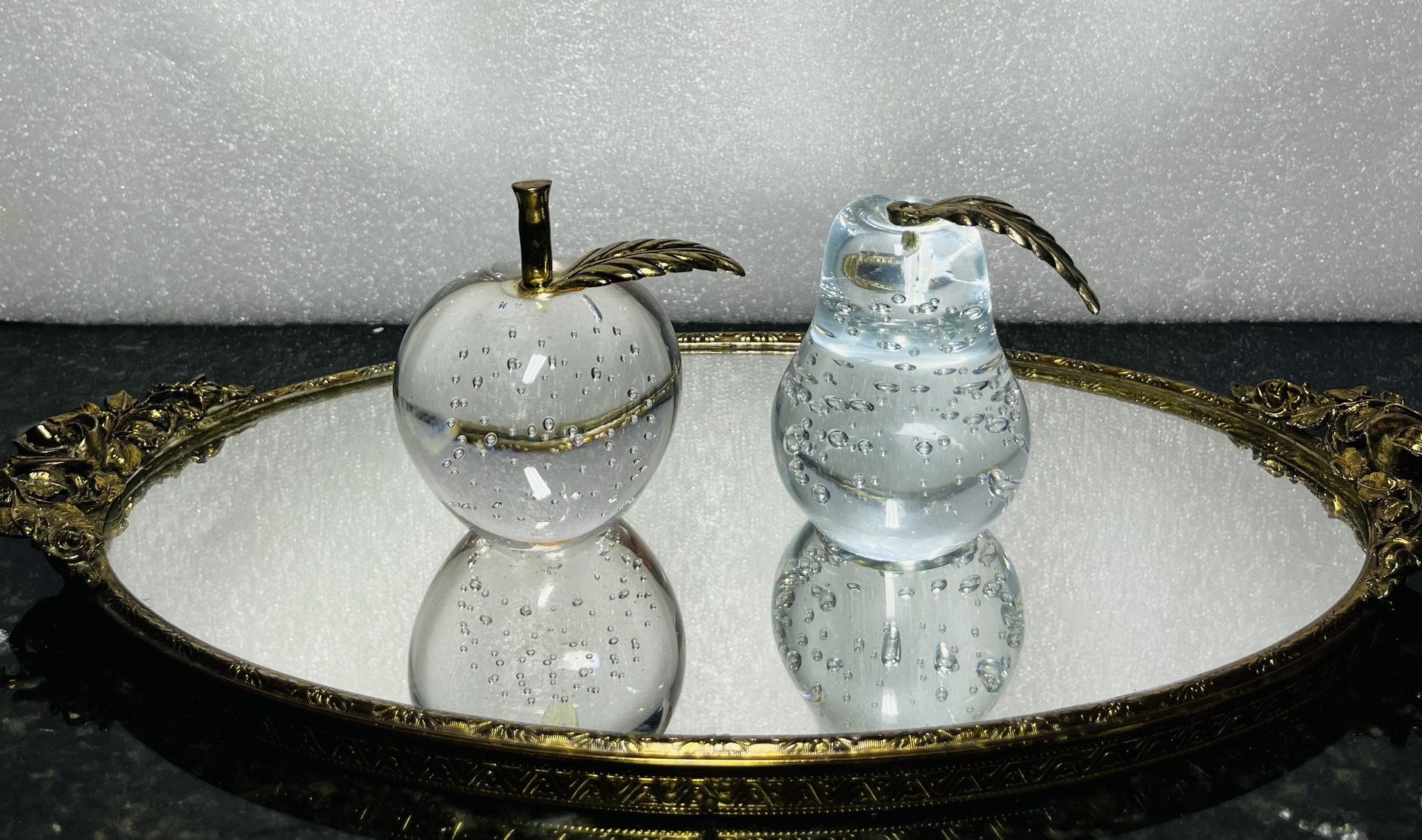 Vintage Paperweight Apple and pear Brass Leaf , Bubbled Glass Paper Weight 4” Please check all the pictures for details