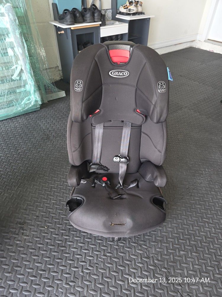 Graco Tranzitions 3-in-1 car seat (forward-facing, highback booster, backless booster). Used condition — has some wear on the fabric (shown in photos), but harness and buckles still work. Great for a backup seat, grandparent car, or extra/spare. Pickup in Zephyrhills.