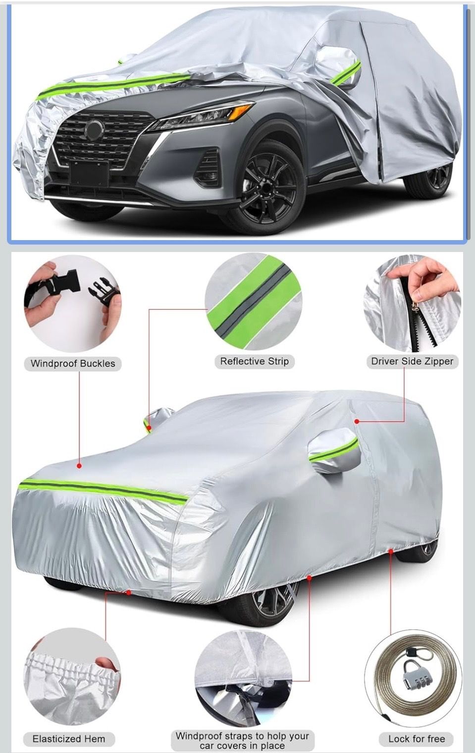 Waterproof Car Covers Replace for 2016-2025 Nissan Kicks, 6 Layers Silver All Weather Custom-fit Car Cover with Zipper Door & Windproof Bands for Snow Rain Dust Hail Protection