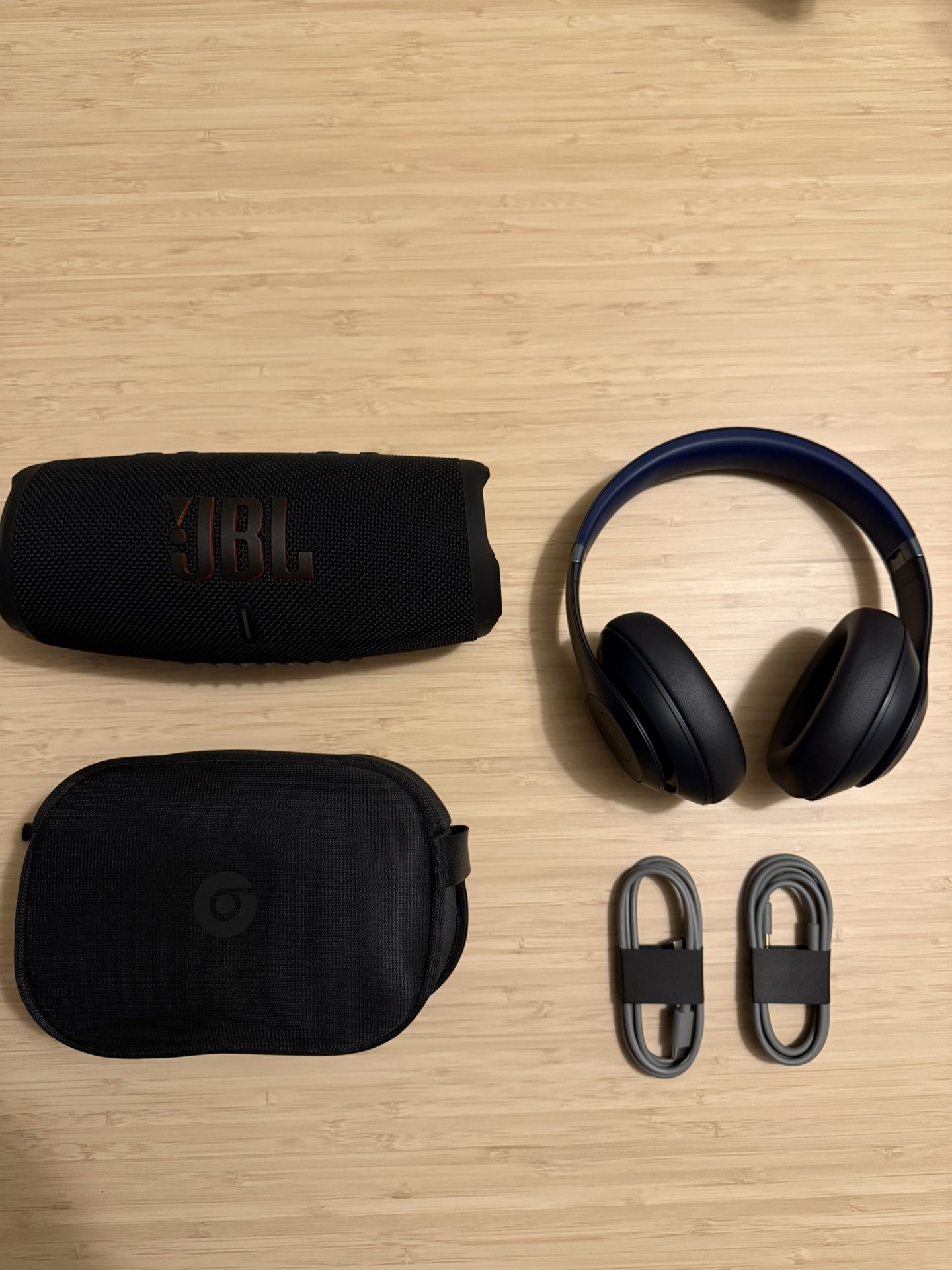 JBL Charge 5 Bluetooth Speaker (black) Dust and waterproof Never used, **no dings, scratches, or dents** Charger NOT included USB-C charging port Beats Studio Pro Noise Cancelling Headphones Color: Navy Never used, **no wear and tear** All original accessories included (cables still wrapped for headphones)