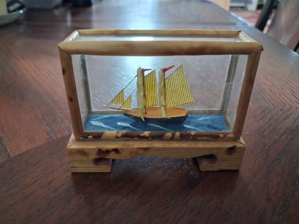 This item is a vintage miniature ship model encased in a glass and bamboo display box. Design: A small handcrafted sailing vessel (often described as a junk boat) is displayed inside a clear glass case framed with bamboo. Purpose: Typically used as a nautical decoration or collectible item, sometimes featured in dollhouses. Materials: Common materials include wood, glass, and paper or fabric for the sails.