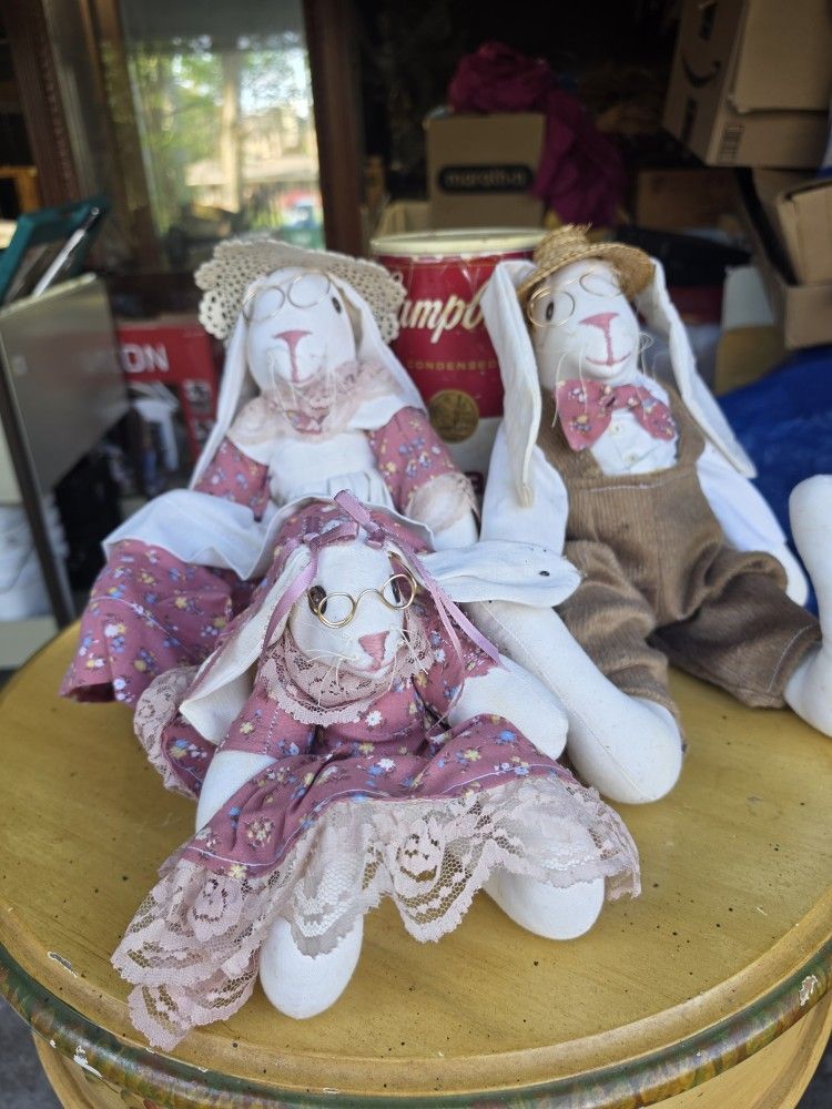 Beautiful bunny rabbit family the dad with overall zone the mom and the daughter have the same dress on. The mom has a wicker hat as well as the dad and they all are wearing eyeglasses it is too cute.