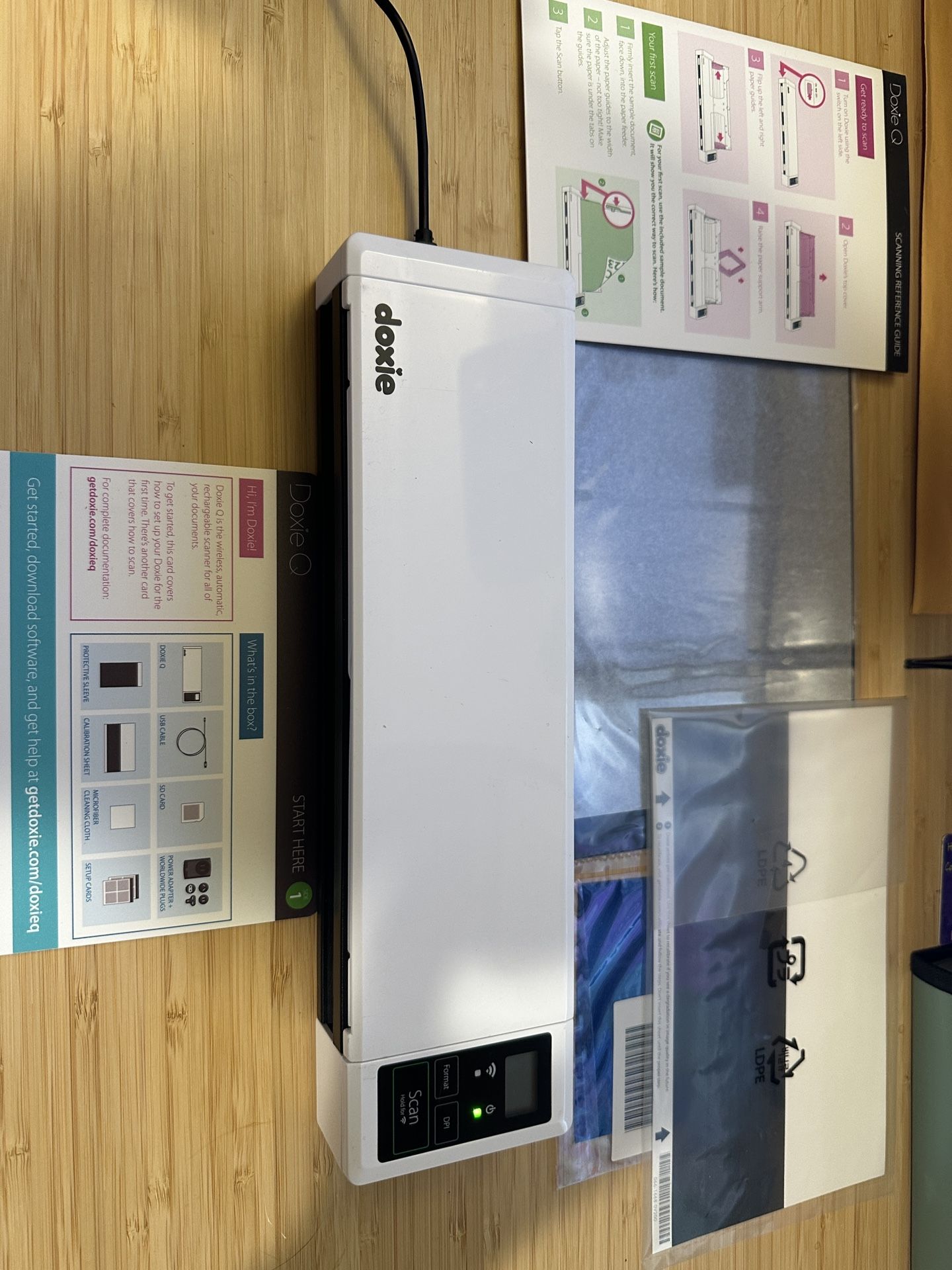 Doxie® Q rechargeable wireless document scanner 8-page collapsible automatic document feeder Doxie apps for going paperless ABBYY® OCR text recognition engine Li-ion rechargeable battery (1000 scans per charge) SD memory card Maintenance kit and microfiber cleaning cloth Worldwide USB power adapter set In perfect condition. Used a dozen times then found ourselves needing something more permanent. Includes all items from original packaging.