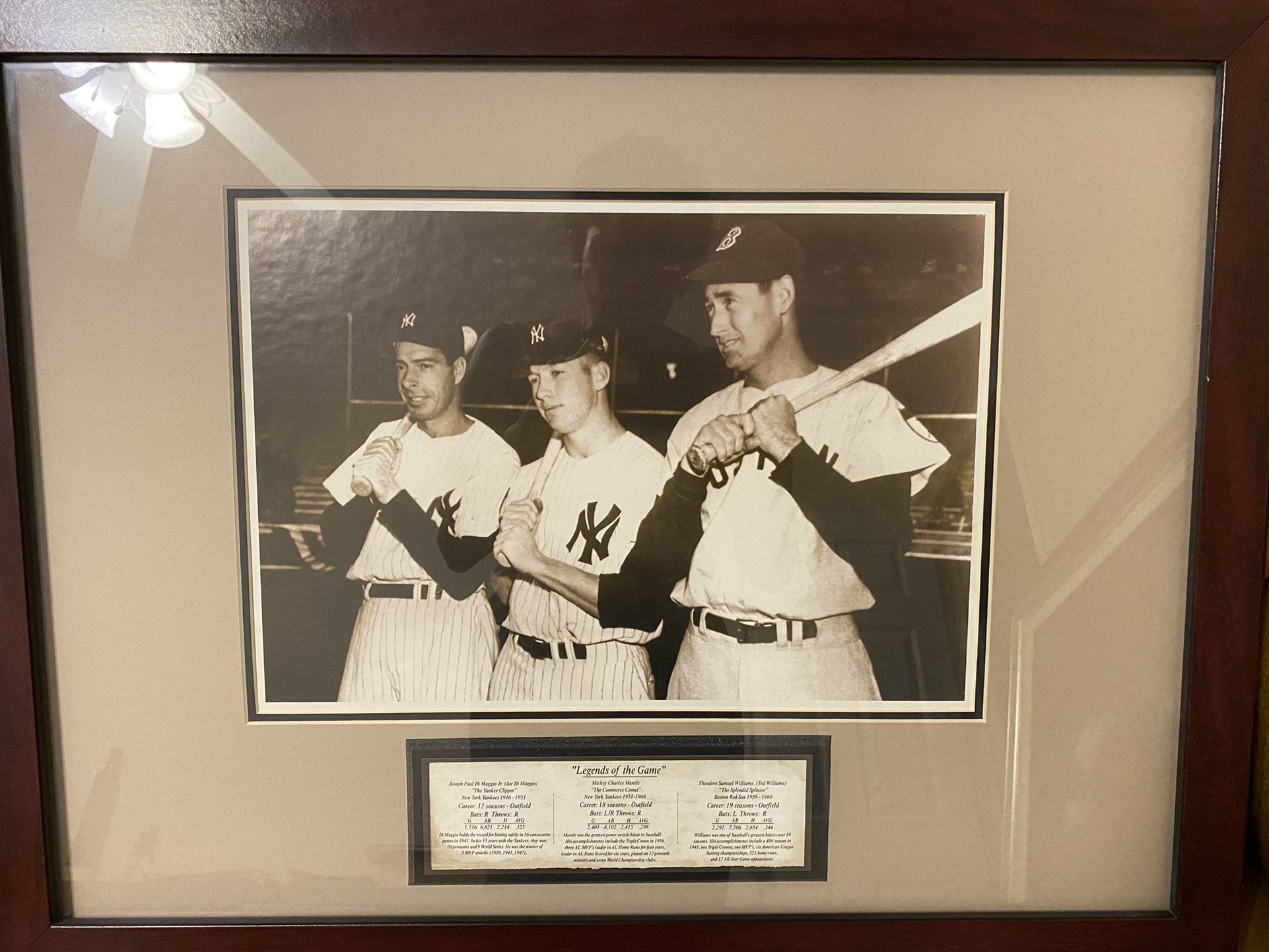 A historical photograph print of Joe Di Maggio, Mickey Mantle, and Ted Williams, of the NY Yankees, and the Boston Red Sox, A historical depiction of three Great Legends. 26” x 20”. In excellent condition.