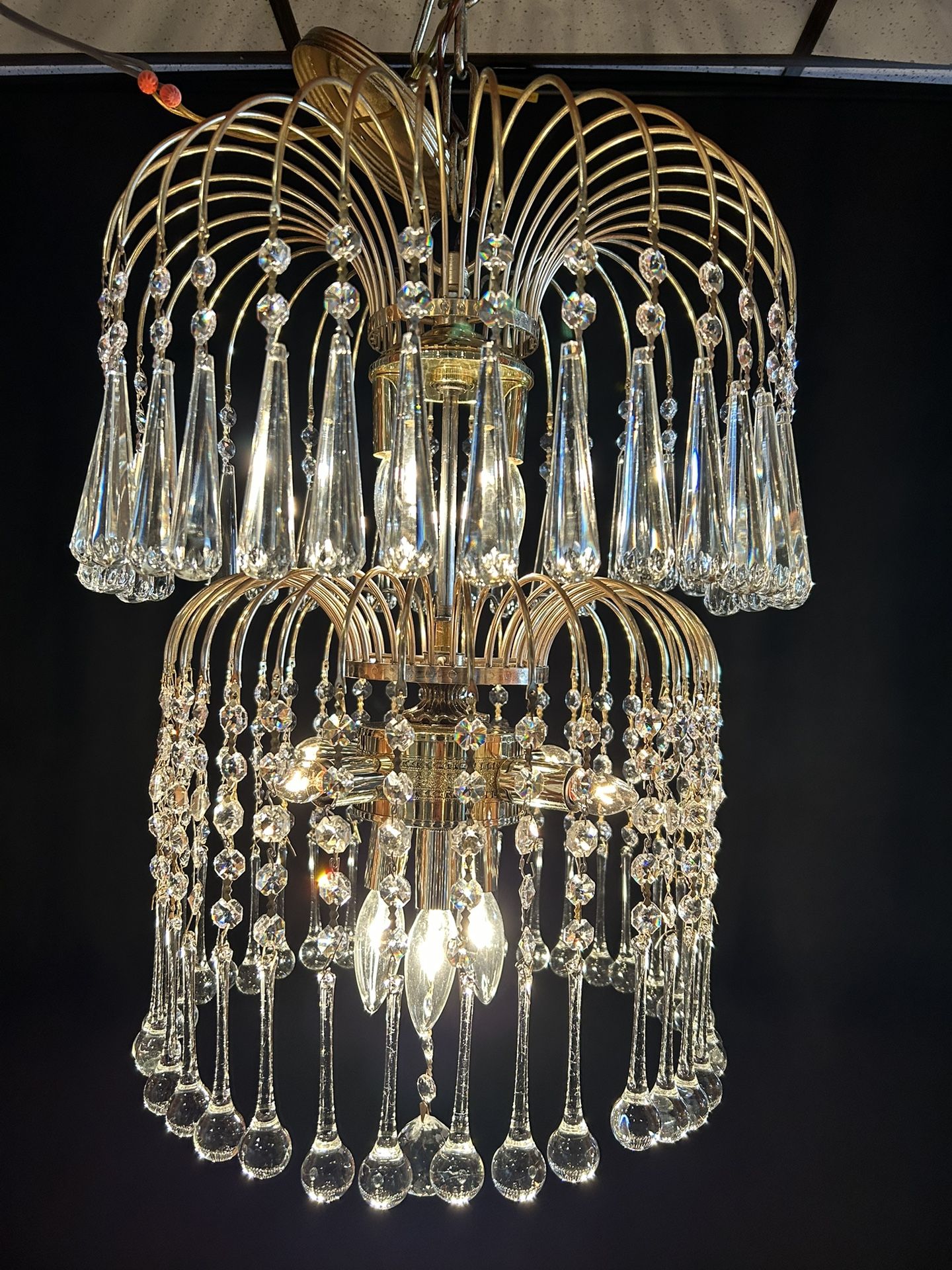 Medium chandelier Gold color Not found in market My design Has 9 working lights With chain and ceiling electric cap Tone of prisms 22 inches long 16 inches wide