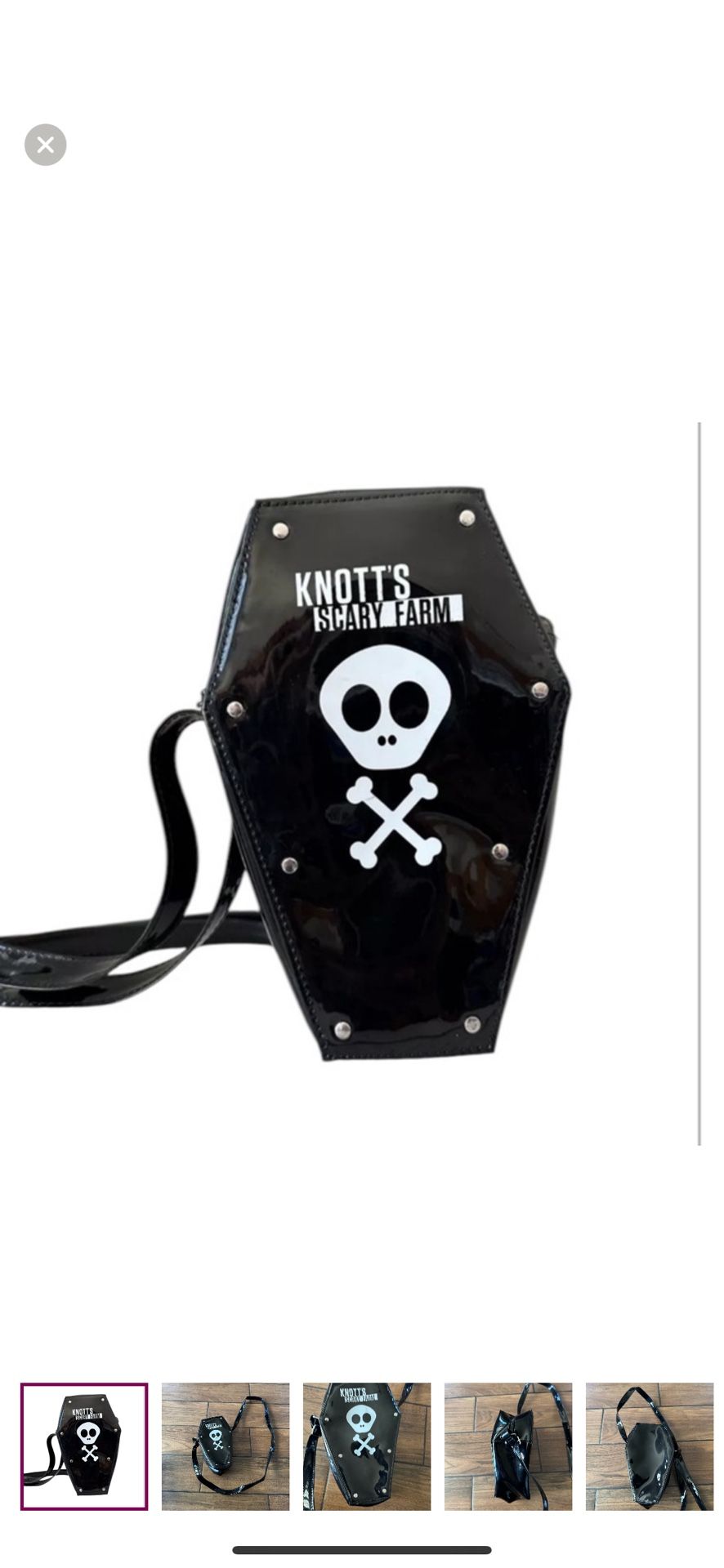 Knott's Berry Scary Farm Goth Skull Black and White Coffin Crossbody Purse Bag. Top zip. Condition-excellent pre owned Black / white Vinyl H 9" / W 5.5" / D 4" DDs 18" approx $18