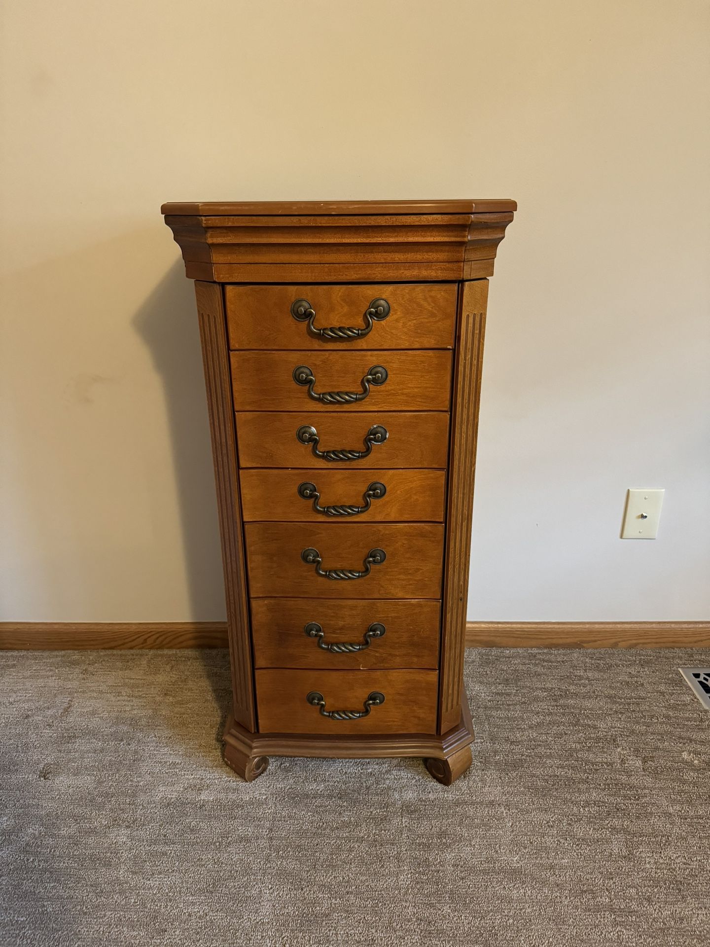 FEEL FREE TO MAKE AN OFFER!!!!! 7 Drawers in ascending heights Jewelry Armoire w/ 2 side swing doors with Hinge Opening top and mirror Softly lined drawers with jewelry compartment storage for necklaces, earrings, rings and small accessories Some scuff marks/scratches from moving but overall in great condition for this piece of furniture