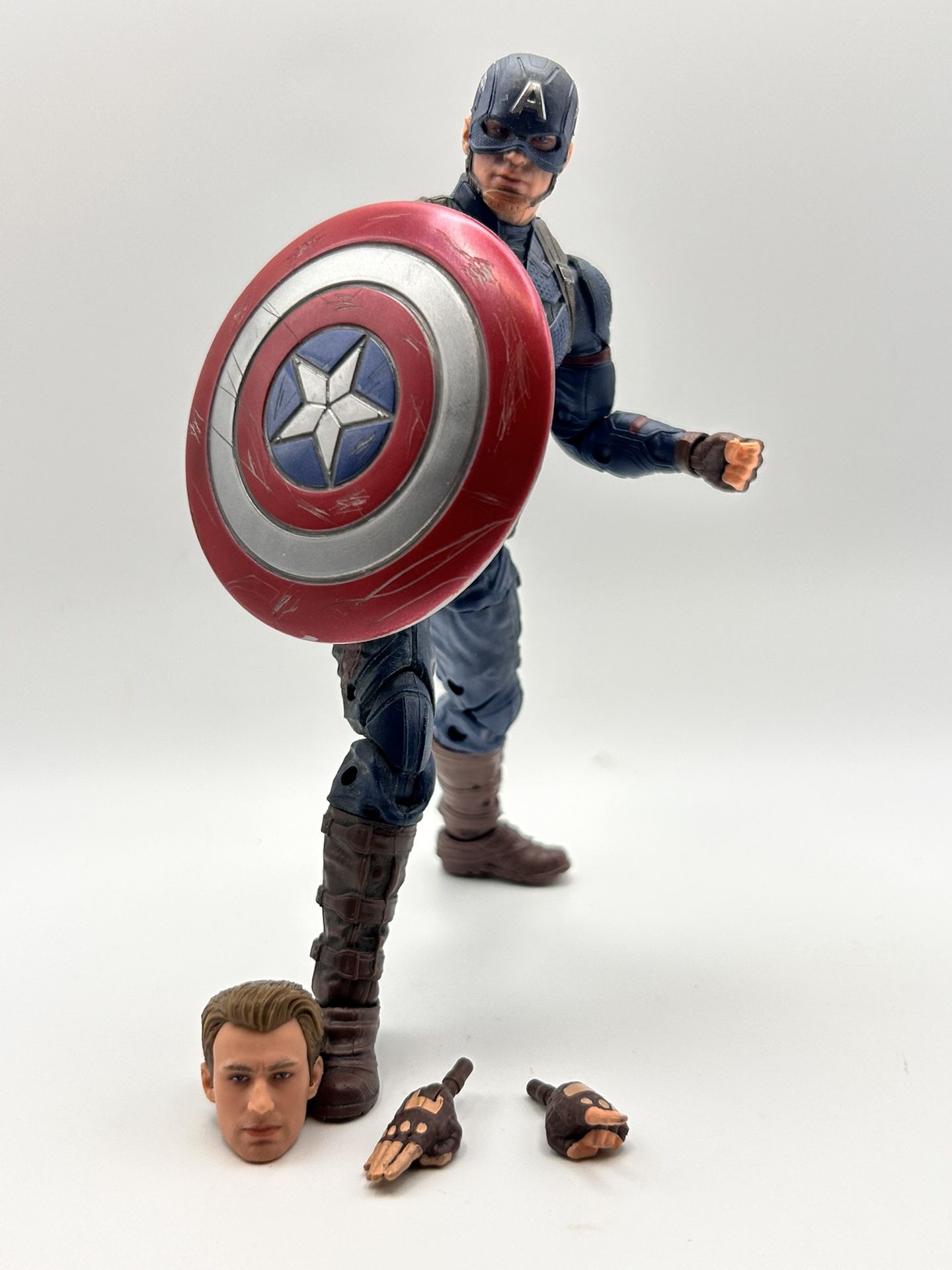 Marvel Legends Endgame Captain America. This is a battle damaged sort of custom I got. The shield is scratches and scuffs and the suit was weathered with some black paint for a dirt effect. Feel free to ask questions! Thank You.