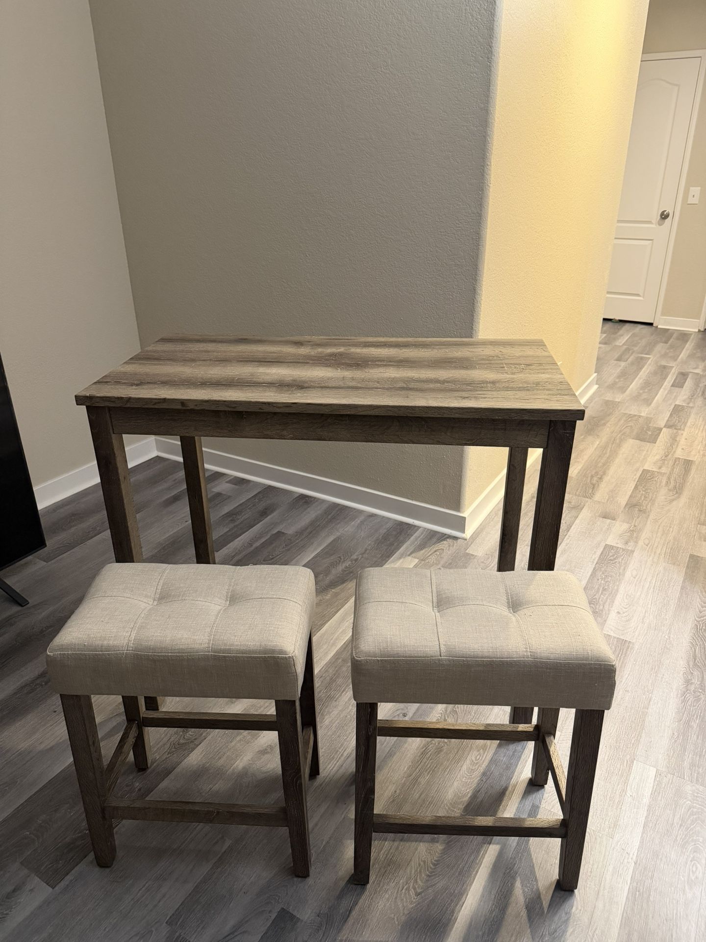 Light Brown table and stools Table: L- 3.5’ W- 22” H- 3’ Stools : L-18” W-11” H-2’
