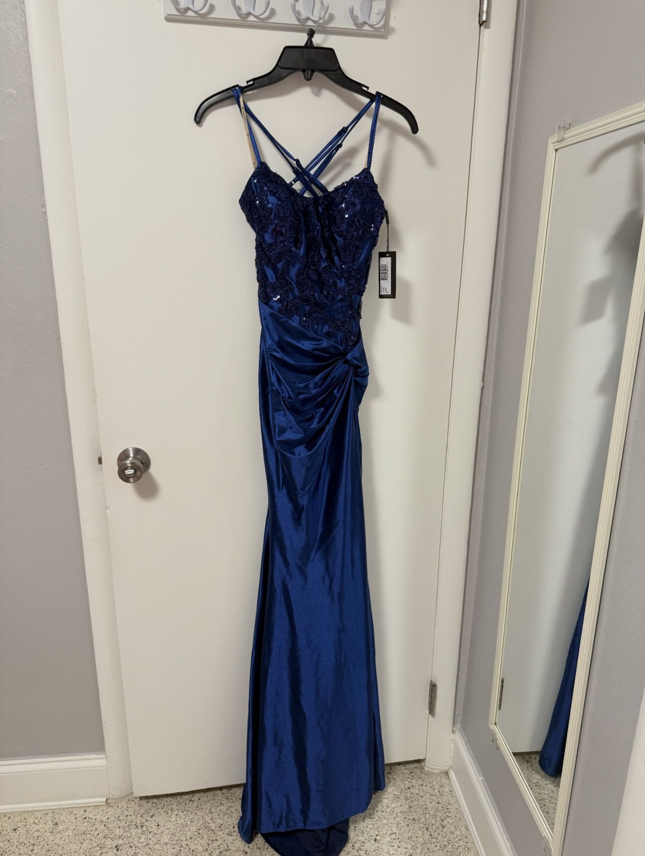 Only been used once. Satin Long Gown with Embellished Sequin Bustier and Knot Waist: Faviana Style 11005. Knotted waist and ruched butt to cinch in the look with an embellished sequin bustier. In a size 2.